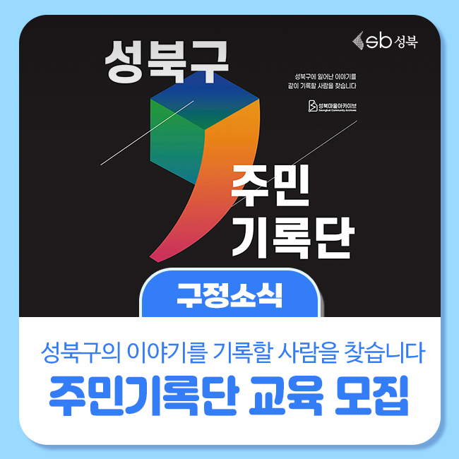 안녕하세요 성북누리입니다. 성북구의 사람, 장소 등 숨겨진 이야기를 내 손으로 직접 기록하는 아주 특별한 활동, '성북구 주민기록단' 교육생 모집을 전해드리려고 합니다. 소중한 성북구의 이야기들을 담아낸 '주민기록단'이 새로운 얼굴을 찾고 있습니다! 👀✨📝 성북구 주민기록단 교육생 모집 🙋♀️ 모집대상 마을기록에 관심 있는 성북구 주민 및 생활권자(직장·학교) *모집인원 ...