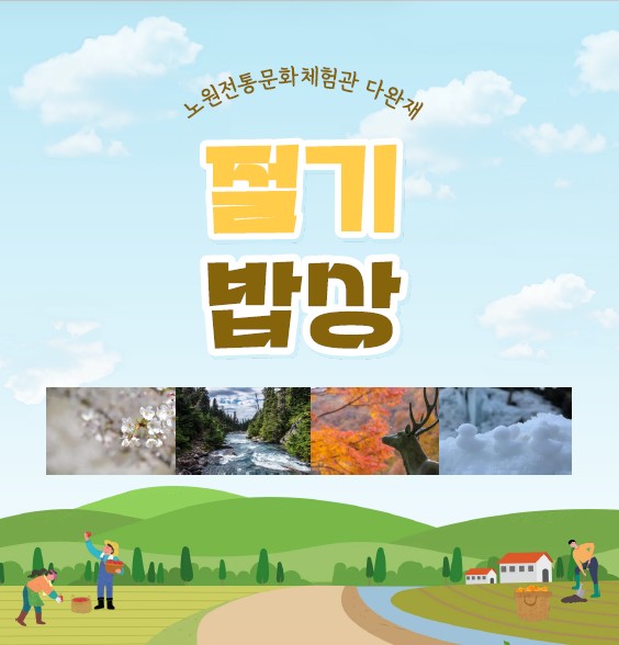노원전통문화체험관 다완재 <절기밥상 – 여름의 시작, 입하 / 초록세상 가득해요, 소만> 제철에 자란 먹을거리를 알고 활용한 우리 선조들의 지혜를 나누며 우리 몸과 마음이 함께 건강해지는 시간을 가져봅니다. 신청기간 4. 15. ~ 5. 13. 23시까지 모집정원 총 12명 진행내용 5/14 : 각색바람떡, 떡수단 5/28 : 뽕잎나물장아찌, 뽕나무새순튀각 준비물: 필기도구, 앞치마, 행주, 음식 담을 용기, 재료비 재료비: 회당 10,000원 총 2만원 (재료비는 수업 첫 날 강사님께 직접 납부하시면 됩니다. 납부하신 재료비는 재료 준비로 인한 환불 불가 임을 안내드립니다.) 문의 02-2116-2474