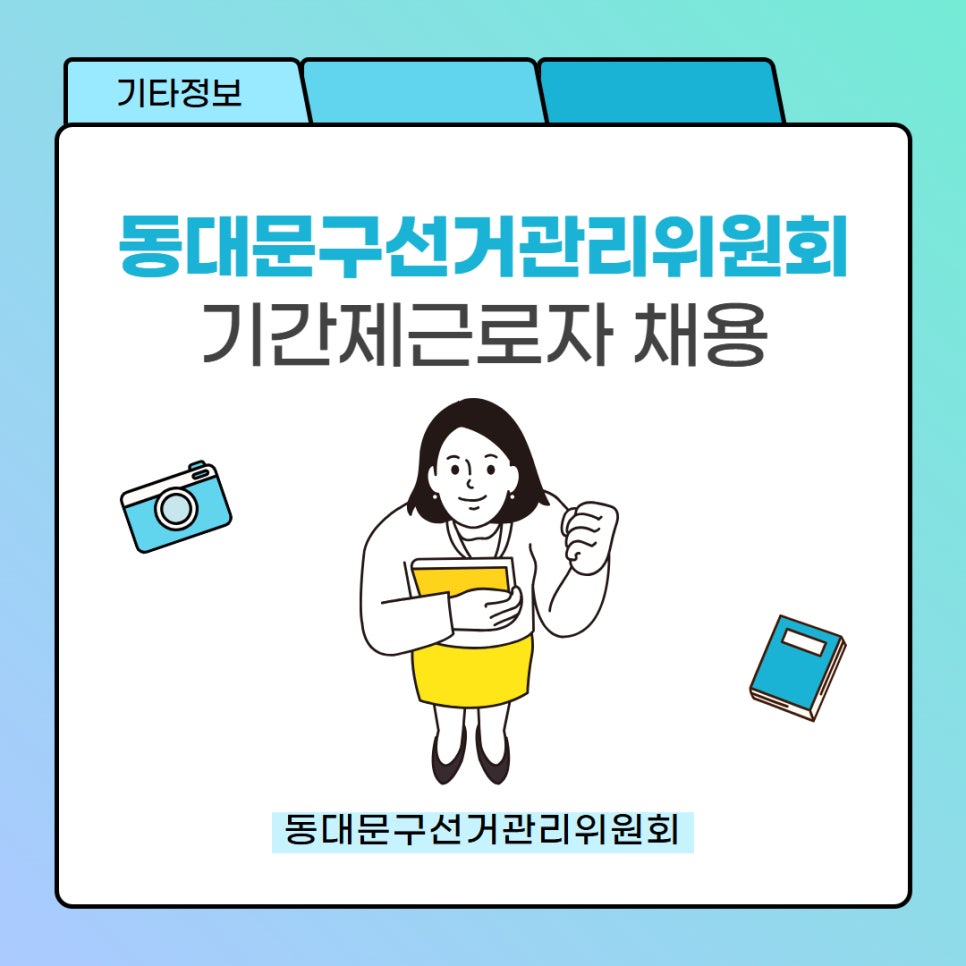 동대문구선거관리위원회 기간제근로자 채용 공고 다가오는 제9회 전국동시지방선거와 관련하여 동대문구선거관리위원회에서 기간제근로자를 공개모집합니다. 📢🗳️ 채용분야: 행정사무보조직 (선거비용 실사 보조) 🗳️ 근무기간: 6. 15.(월) ~ 7. 29.(수) 🗳️ 근무장소: 동대문구선거관리위원회 서울특별시 동대문구 답십리로 64길 16 🗳️ 보수: 1일당 90,830원...