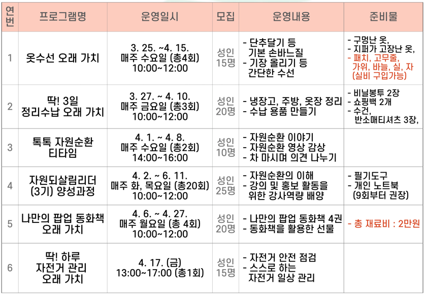 📅 신청 기간 및 방법 2026년 2월 27일(금)부터 선착순 접수 서대문구청 홈페이지 > 주요서비스 > 통합신청 https://www.sdm.go.kr/applyTotal.do 서대문구청 > 민원신청/발급 > 통합신청프로그램 서대문구청 > 민원신청/발급 > 통합신청프로그램 www.sdm.go.kr 통합신청은 개별 로그인 필수 📍 운영 장소 자원되살림센터(모래내로 369) 등 ...