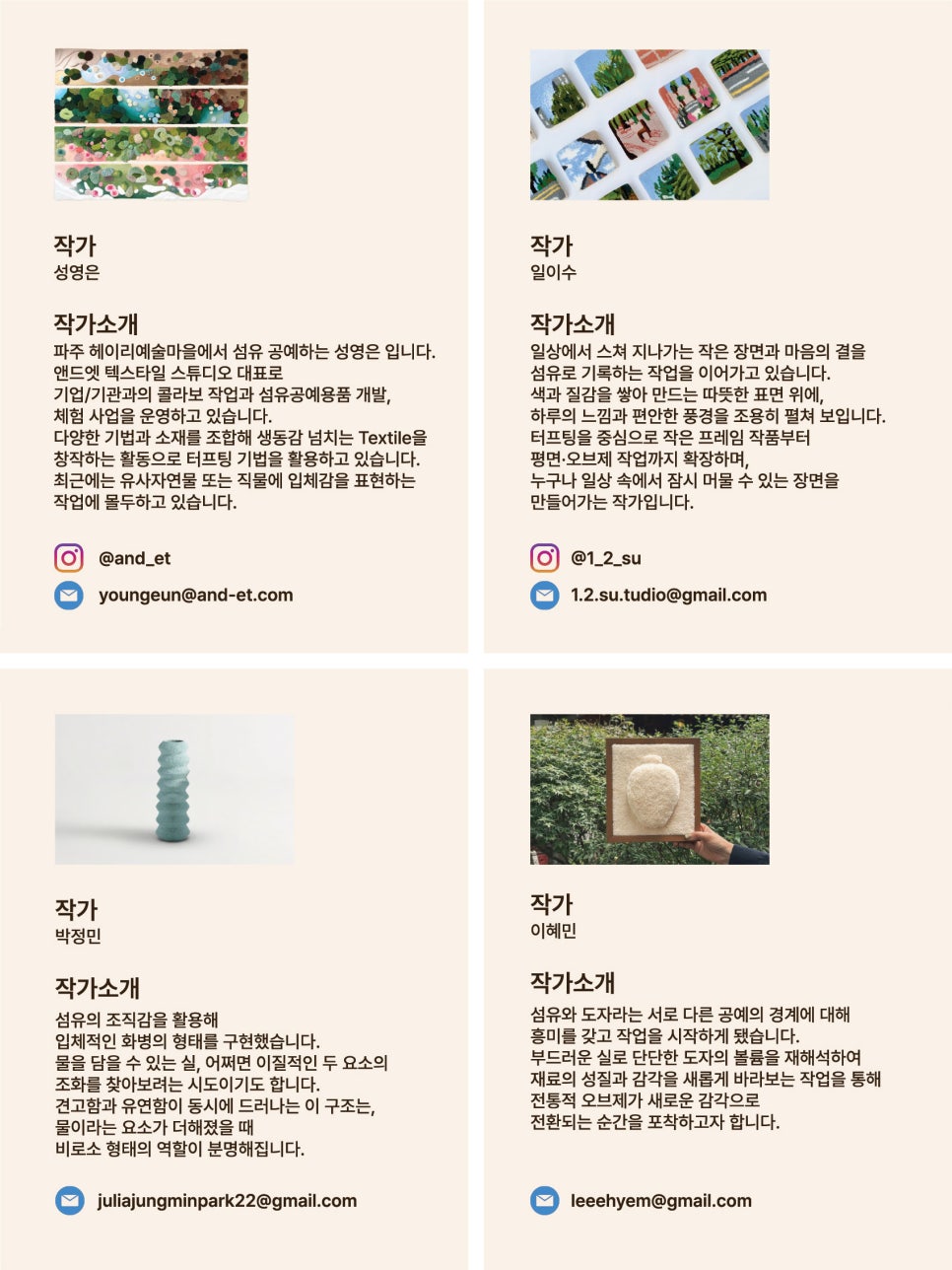 쌀쌀한 겨울, 실 한 올 한 올에 담긴 온기로 마음을 채우는 전시 <터프팅, 실의 결을 담다 「그리고 展」> 터프팅이란, 천 위에 색색의 실로 마치 잔디를 심듯 촘촘히 쏘아 올려 직조하는 공예 기법이다. 다양한 색의 사용과 디자인을 통해 자신의 개성을 작품에 드러낼 수 있어서인지, 요즘 MZ세대 사이에선 터프팅 공예가 새로운 취미와 이색 체험으로 관심받고 있다. 노원책상...
