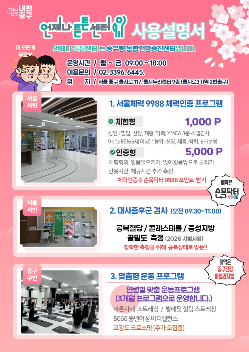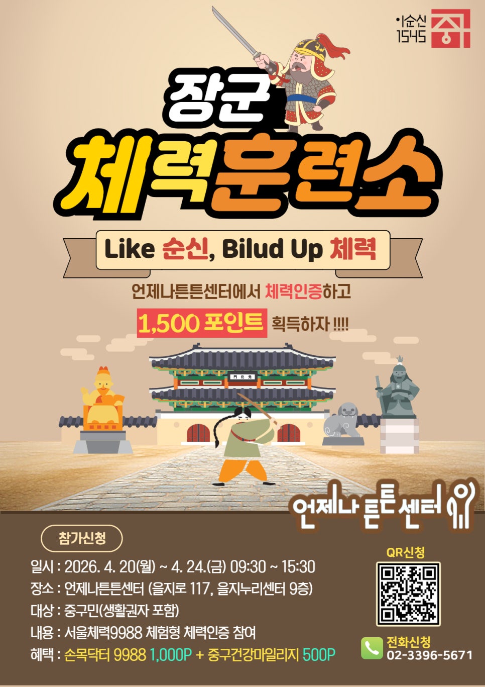 요즘 건강관리, 다들 어떻게 하고 계신가요? 😊 서울 중구에는 누구나 무료로 이용할 수 있는 중구형 통합건강증진센터 언제나튼튼센터가 있다는 사실! 이번에는 특별히 이순신 장군 콘셉트로 진행되는 ✨장군 체력훈련소 프로그램✨이 운영됩니다. 🏃♂️ 장군 체력훈련소 참여 안내 ✔기간: 2026.4. 20.(월) ~ 4. 24.(금) ✔시간: 09:30 ~ 15:30 ✔장소...