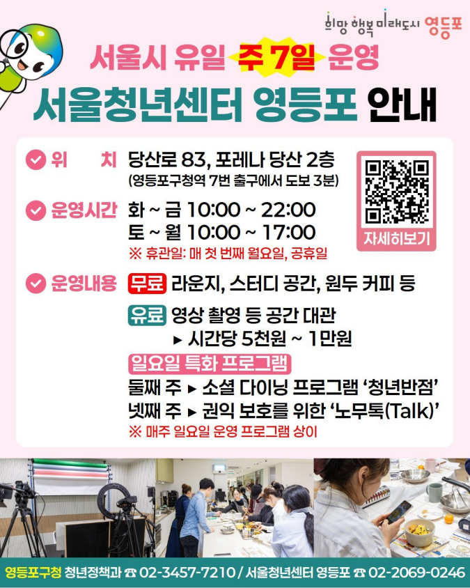 요즘 공부할 공간도 필요하고, 편하게 쉬면서 다양한 프로그램까지 즐길 수 있는 청년 공간 찾고 계신가요?! 영등포구에서 울시에서 유일하게!! 주 7일을 운영하는 서울청년센터가 있어 청년들에게 큰 관심을 받고 있습니다🙌🏻 스터디, 커뮤니티 활동, 휴식은 물론 영상 촬영 공간과 특별 프로그램까지 마련되어 있어 청년이라면 꼭 알아두면 좋은 공간인데요✨🩷 서울청년센터 영등포란...