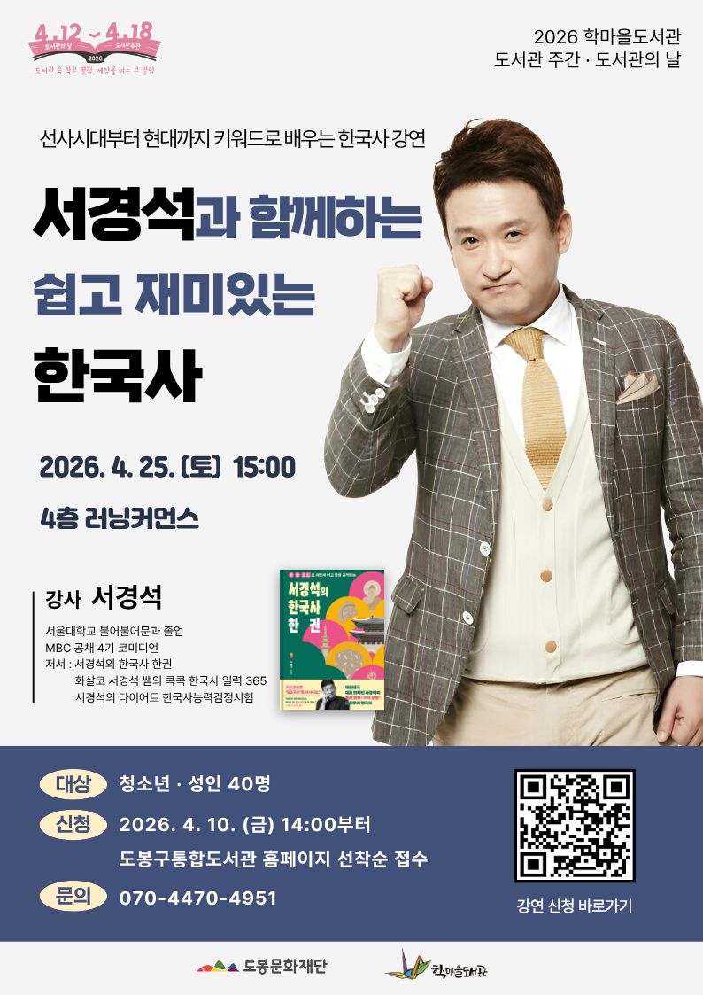 서경석 작가와의 만남 <서경석과 함께하는 쉽고 재미있는 한국사> 선사시대부터 현대사까지 방대한 양에 어렵게 느껴졌던 한국사를 서경석 작가의 재치 있는 압담과 스토리텔링으로 한국사를 배워봅니다. ※주제도서: <서경석의 한국사 한 권> 서경석 지음 / 창비교육/ 2025 ★ 1인 1신청 을 꼭! 부탁드립니다! ★ 문의) 070-4470-4951 신청 바로가기 : https://www.unilib.dobong.kr/edusat/view.do?edu_idx=5860&prepage=%2Fedusat%2Flist.do%3Fsh_ct_idx%3D4