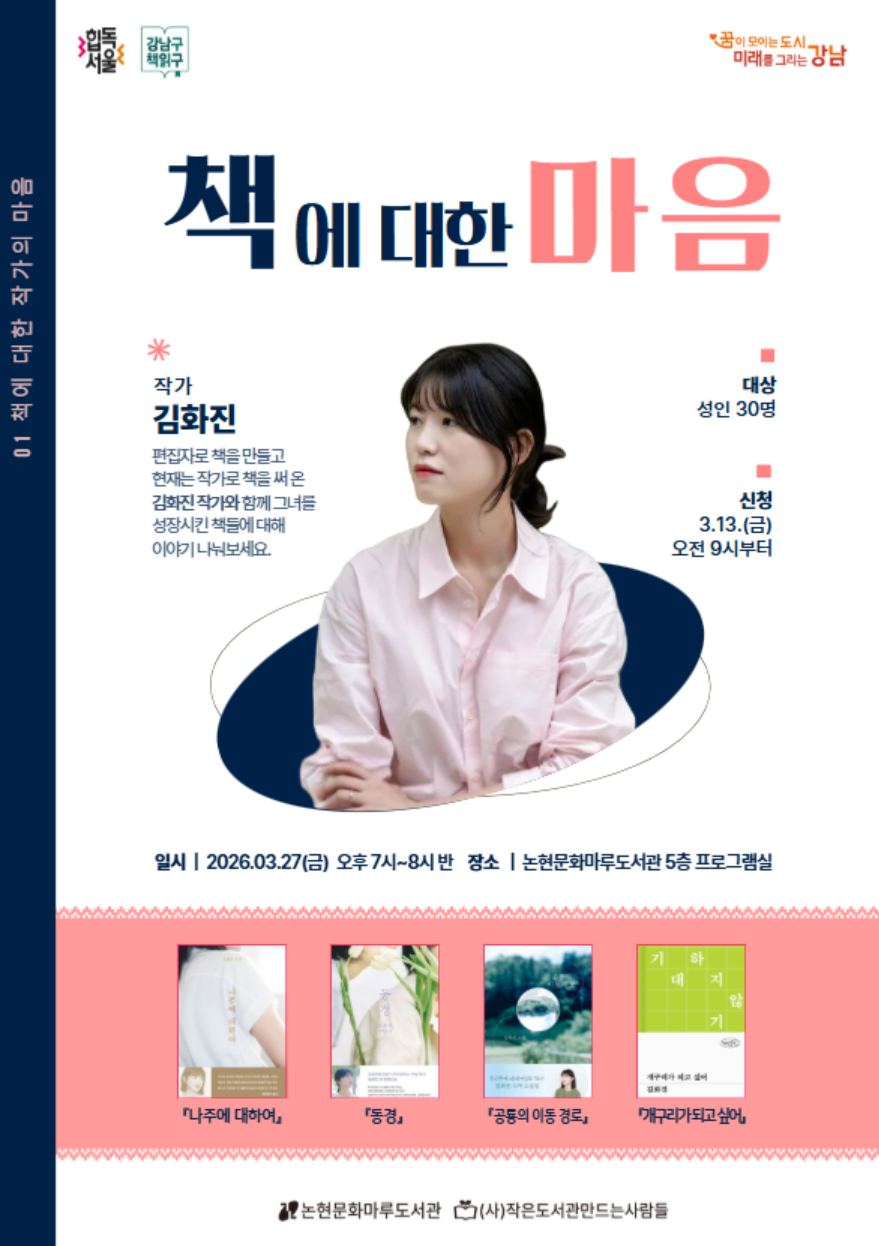 ● 사 업 명 : 책에 대한 마음 - 1강 김화진 작가 ● 활동내용 : 편집자에서 작가로 자리를 옮긴 경험을 바탕으로, 책을 만드는 과정을 편집자와 작가 두 시선에서 이야기 나누는 프로그램 ● 모집대상 : 성인 ● 모집인원 : 30명 ● 모집기간 : 2026.03.13(금) 9:00 ~ 2026.03.25(수) 18:00 ● 진행기간 : 2026-03-27 (금) 19:00 ~ 20:30 ● 진행장소 : 논현문화마루도서관 5층 프로그램실 ● 접수방법 : 홈페이지 신청 ( https://library.gangnam.go.kr/nmmlib/menu/13456/program/30013/lectureDetail.do?currentPageNo=1&searchCategory=&manageCd=MN&searchStatusCd=&lectureIdx=32460#none ) ● 문의방법 : 02-512-8580 ※ 자세한 사항은 ( https://library.gangnam.go.kr/nmmlib/menu/13456/program/30013/lectureDetail.do?currentPageNo=1&searchCategory=&manageCd=MN&searchStatusCd=&lectureIdx=32460#none ) 참고 바랍니다.