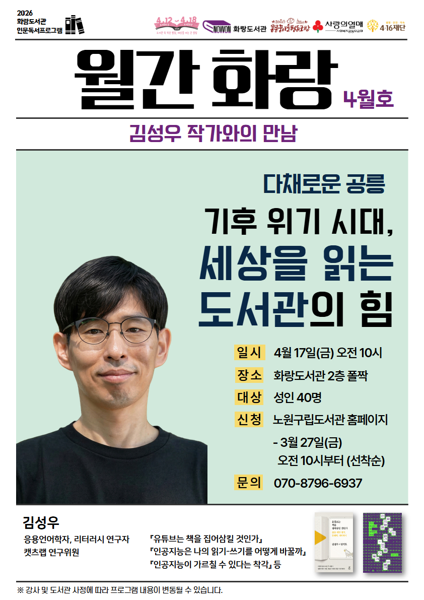 노원화랑도서관 <월간화랑/4월 김성우 작가와의 만남> 2026년 화랑도서관 4월 도서관의 날, 도서관주간 행사 인문독서프로그램 <월간 화랑> "기후위기 시대, 세상을 읽는 도서관의 힘"을 주제로 김성우 작가님과 함께합니다. 쏟아지는 정보 속에서 길을 잃기 쉬운 요즘, 세상을 바르게 읽어내는 힘은 혼자가 아닌 "함께"일 때 비로소 완성됩니다. "도서관"에서 함께 읽기로 단단한 리터러시를 만들어 가보는 시간 어떠세요? 건강한 공동체의 힘으로 더 깊고 바른 지혜를 나누고 싶은 여러분을 초대합니다. 4월 17일(금) 오전 10시, 화랑도서관 2층 폴짝에서 함께해요~ * 신 청: 3월 27일(금) 오전 10시~ 선착순 마감 * 대 상: 성인 40명 * 문 의: 070-8796-6937 ※ 온라인 신청 및 진행시 유의사항 - 노원구립도서관 홈페이지 로그인 후 신청가능합니다. - 프로그램 참여 시 사진 촬영이 이루어질 수 있으며, 촬영된 사진은 내부 문서 및 자료집 제작에 활용될 수 있습니다. - 사전 연락 없이 프로그램에 참여하지 않을 경우, 이후 프로그램 신청에 제한(패널티)이 있을 수 있습니다. - 주차 공간이 협소하오니 가급적 대중교통 이용을 부탁드립니다. - 강사 및 도서관 사정에 따라 프로그램 내용이 변동될 수 있습니다.
