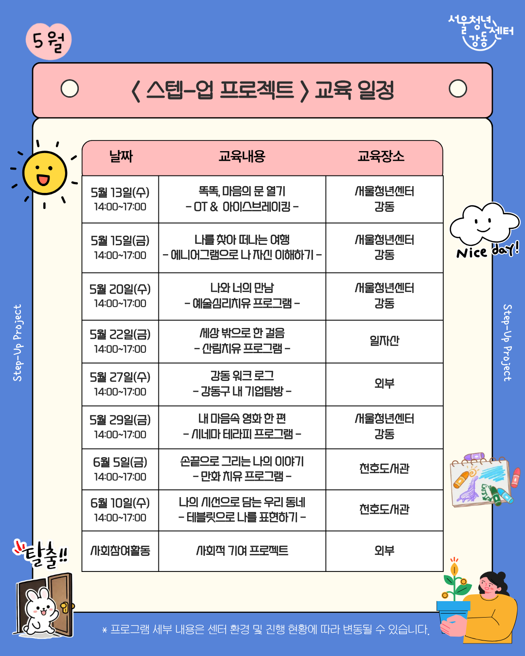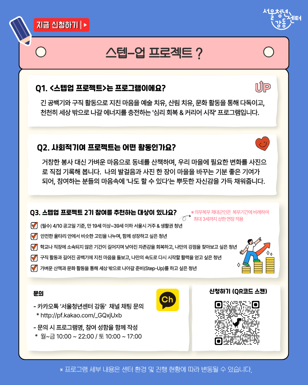🌞 스텝-업 프로젝트 2기 참여자 모집합니다 ~! 🌞 "내 마음의 일시정지 해제! 다시 시작하는 따뜻한 첫걸음" 마음의 '일시정지'를 누르고 잠시 쉬어가는 청년들을 위해, 서울청년센터 강동이 가장 다정한 손길을 내밉니다. 억지로 달릴 필요 없습니다. 나만의 속도로, 예술과 자연 속에서 다시 시작할 용기를 얻는 <스텝-업 프로젝트> 참여자를 모집합니다. ✨ <스텝-업 프로젝트>란? 긴 공백기와 구직 활동으로 지친 마음을 예술 치유, 산림 치유, 문화 활동을 통해 다독이고, 천천히 세상 밖으로 나갈 에너지를 충전하는 '심리 회복 & 커리어 시작' 프로그램입니다. 🧡🧡신청 방법: https://forms.gle/jJ7kf9b9FVCFJbqE6 ⏰ 1. 교육 커리큘럼 - 5/13(수) 14:00~17:00(3시간) / 1회차: 똑똑 , 마음의 문 열기(OT & 아이스브레이킹) - 5/15(금) 14:00~17:00(3시간) / 2회차: 나를 찾아 떠는 여행 (에니어그램으로 나 자신 이해하기) - 5/20(수) 14:00~17:00(3시간) / 3회차: 나와 너의 만남 (예술심리치유 프로그램) - 5/22(금) 14:00~17:00(3시간) / 4회차: 세상 밖으로 한 걸음 (산림치유 프로그램) - 5/27(수) 14:00~17:00(3시간) / 5회차: 강동 워크 로드 (강동구 내 기업탐방) - 5/29(금) 14:00~17:00(3시간) / 6회차: 내 마음 속 영화 한 편 (시네마 테라피 프로그램) - 6/5(금) 14:00~17:00(3시간) / 7회차: 나만의 캐릭터 만들기 (청년마을리빙랩) - 6/10(수) 14:00~17:00(3시간) / 8회차: 그림책 만들기 (청년마을리빙랩) - 사회적기여 프로젝트 : 교육 후, 17:00 ~ 18:00 (1시간, 지역탐방 및 장소 사진 촬영 활동) - 진행 장소: 서울청년센터 강동, 외부활동 (▶센터 위치 : https://naver.me/G65t6yaX) ※해당 프로그램은 8회기, 사회기여 프로젝트 모두 참여 가능한 청 년을 선발합니다. 🙋♀️ 2. 이런 청년을 찾습니다! - (필수) 4/10 공고일 기준, 만 19세 이상~39세 이하 서울시 거주 & 생활권 청년 ※연령연장: 의무복무 제대군인은 복무기간에 비례하여 최대 3세까지 상한 연장 적용 - 안전한 울타리 안에서 비슷한 고민을 나누며, 서로 위로하고 외로움과 고립감을 해소하고 싶은 청년 - 학교나 직장에 소속되지 않은 기간이 길어지며 낮아진 자존감을 회복하고, 나만의 강점을 찾아보고 싶은 청년 - 구직 활동과 길어진 공백기에 지친 마음을 돌보고, 나만의 속도로 다시 시작할 활력을 얻고 싶은 청년 - 가벼운 산책과 문화 활동을 통해 세상 밖으로 나아갈 준비(Step-Up)를 하고 싶은 청년 🔔 3. 참여자 선정 - 교육 신청 : ~5/5(화) 23:59까지 - 전화 인터뷰 : 5/9(수) 오후 중 개별 연락 예정 (*010 번호로 문자가 발송됩니다) ※ 1인당 15분 내외 소요 예정 - 선정 발표 : 5/10(목) 오후 중 개별 연락 예정 (*010 번호로 문자가 발송되며, 오픈채팅방 입장을 안내합니다.) 💥미선정자에게는 별도로 안내해 드리지 않습니다. 💥선정자의 경우, 문자로 안내해 드리는 "프로그램 사전조사"를 응답해 주셔야 최종 참여자로 확정됩니다. 그외 자세한 내용은 신청 링크에서 확인하세요~!