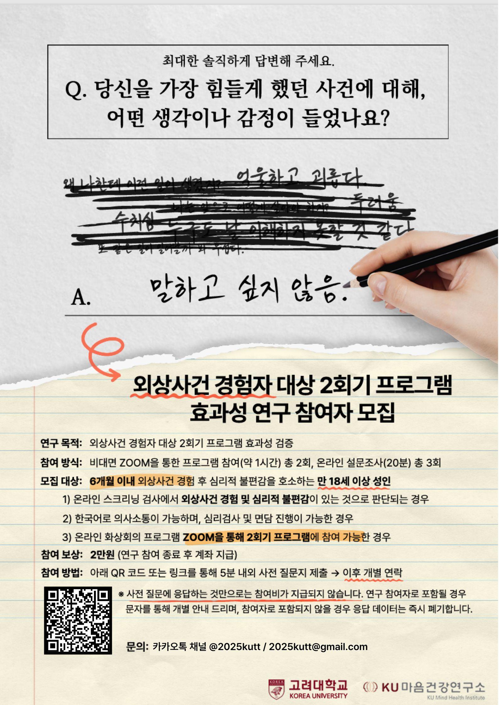 연구 목적: 외상사건 경험자 대상 2회기 프로그램 효과성 검증 참여 방식: 비대면 ZOOM을 통한 프로그램 참여(약 60분) 총 2회, 온라인 설문조사(1시간 이내) 3회 모집대상: 6개월 이내 외상사건 경험 후 심리적 불편감을 호소하는 만 18세 이상 성인 1) 온라인 스크리닝 검사에서 외상사건 경험 및 심리적 불편감이 있는 경우로 판단되는 경우 2) 한국어로 의사소통이 가능하며, 심리검사 및 면담 진행이 가능한 경우 3) 온라인 화상회의 프로그램 ZOOM을 통해 2회기 프로그램에 참여 가능한 경우 참여보상: 2만원 (연구참여 종료 후 계좌 지급) 참여방법: - QR코드 또는 링크를 통해 사전 질문지 제출(5분 내외) ※ 사전 질문에 응답하는 것만으로는 참여비가 지급되지 않습니다. -연구참여자로 포함될 경우 문자를 통해 개별 안내드립니다. -연구참여자로 포함되지 않을 경우, 사전 질문 응답 데이터는 즉시 폐기합니다. 문의: 카카오톡 채널 문의 또는 2025kutt@gmail.com 링크: https://kupsychology.qualtrics.com/jfe/form/SV_b3Iip4JgVaxOTKm
