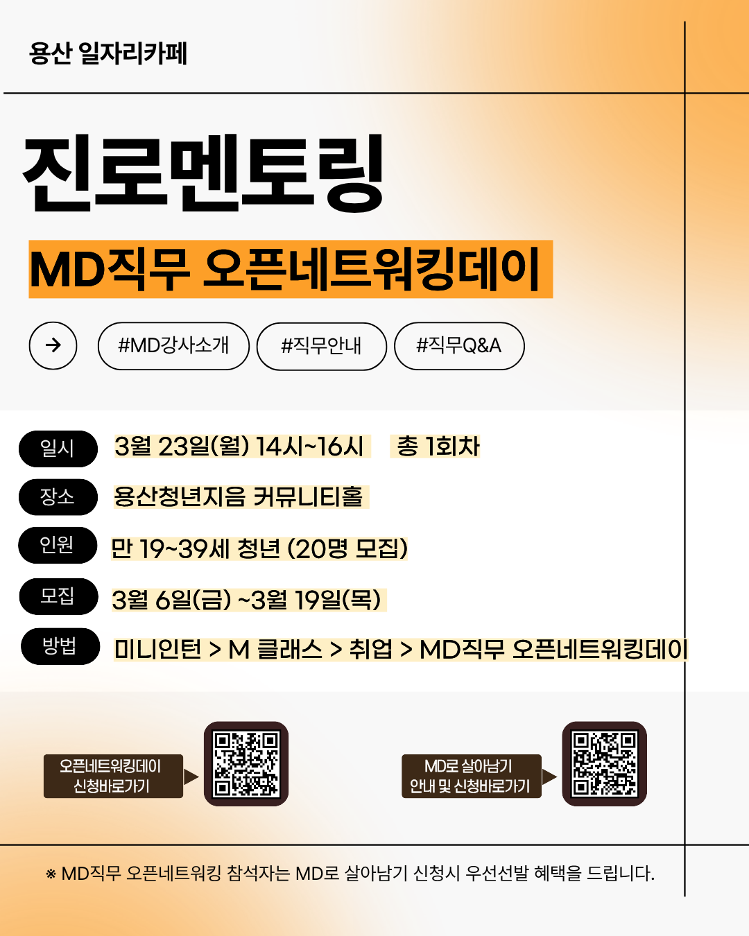 [진로멘토링] MD직무 오픈네트워킹데이 유통·패션·이커머스 등 다양한 산업에서 활약하는 MD 직무 하지만 실제 어떤 일을 하는지, 어떻게 준비해야 하는지 궁금하지 않으셨나요? MD 강사 2명과 함께하는 오픈 네트워킹 데이에서 실제 현업 이야기와 커리어 경험을 직접 들어보고 MD 직무에 대한 궁금증을 자유롭게 질문해보세요! 😊 ⭐️강의목표⭐️ MD의 경험 공유를 통해 MD 직무에 대한 실제 업무 이해도 향상 오픈 네트워킹을 통해 직무에 대한 궁금증 해소 및 정보 획득 ⭐️강의대상⭐️ MD 직무에 관심 있는 청년 유통·패션·이커머스 분야 직무를 탐색 중인 청년 MD 직무 이야기를 직접 듣고 싶은 청년 ⭐️진행내용⭐️ - MD 2명의 강사소개 * 남지우 강사: 전 M사 패션유통, W사 제휴MD) * 김민경 강사: 현 프리랜서 MD 및 강사, 전 C사 이커머스, L사 패션브랜드 MD - MD직무소개 - 참여자 Q&A시간 ⭐ 모집 안내⭐ 🔹일자: 3월 23일(월) 14:00 ~ 16:00 (총 1회차) 🔹장소: 용산청년지음 커뮤니티홀 🔹대상: 만19~39세 청년 20명 🔹모집: 3.6(금) ~ 3.19(목) 🔹발표: 3.20(금) 선정 시 개별 문자 안내 🔹비용: 전액 무료 🔥필수: 카톡채널 '용산일자리카페' 친추 🔥우대: 용산구 거주/활동 청년 🔥신청바로가기: https://miniintern.com/event/3105 ※ MD직무 오픈네트워킹데이 , MD로 살아남기 중복 신청가능 ※ 오픈네트워킹 참석자는 MD로 살아남기 신청시 우선선발 혜택을 드립니다. 📞전화 문의📞 02-6261-1933