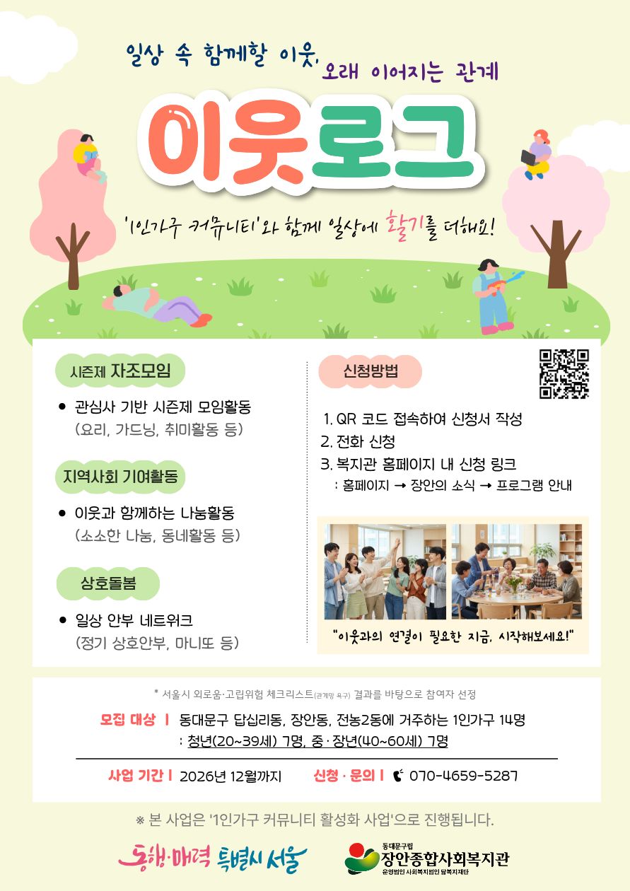 시즌제 자조모임, 나눔활동, 상호돌봄을 통해 자연스럽게 이웃을 만들고 관계를 이어갑니다 : ) ◆모집개요 -진행일정 : 06. 01.(월) ~ 12. 31.(목) -모집대상 : 답십리동, 장안동, 전농 2동 거주 1인 가구 청년 7명 -신청기간 : 04. 07.(화) ~ 05. 31.(일) -신청방법 : 네이버폼 작성 https://form.naver.com/response/utRgx1d9YGIOlMYD51G1cQ -문의 : 장안종합사회복지관 070-4659-5287