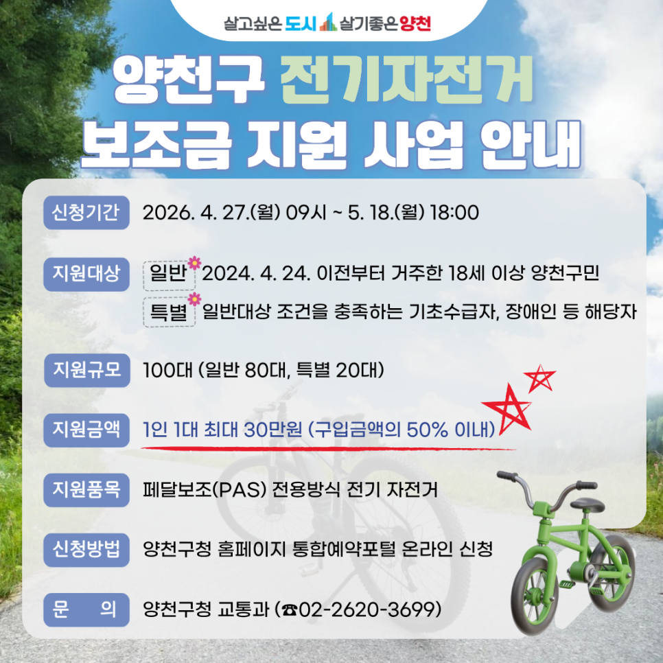 양천구에서는 자전거가 자동차를 대체하는 생활형 교통수단으로 정착할 수 있도록 하기 위해! 전기자전거 구입비용을 지원합니다. 구매하실 계획이 있으신 구민분들은 절대 놓치면 안되겠죠?! 관심있는 구민 여러분들의 많은 신청 바랍니다! 신청기간: 2026. 4. 27.(월) 09:00 ~ 5. 18.(월) 18:00 신청구분: ✅ 일반 대상: 2024. 4. 24. 이전부터 거주한 18세 이상 양천...