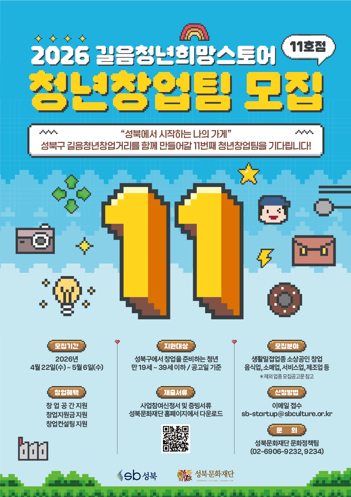 🧡 모집개요 🧡 - 모집대상 : 만19세~39세 이하(공고일 기준) 성북구에서 창업을 준비하는 청년 - 지원점포 : 서울특별시 성북구 삼양로 23 (길음청년창업거리 내) - 모집분야 : 생활밀접업종 소상공인 창업 (음식업, 소매업, 서비스업, 제조업 등) - 지원내용 : 공간지원(1년 월세지원), 창업지원금(2천만원), 컨설팅 등 🧡 모집일정 🧡 - 서류접수 : 2026.04.22.(수) 09:00 ~ 2026.05.06.(수) / 접수 마감일 16시까지 - 서류발표 : 2026.05.11.(월) / 합격자 개별 연락 (발표일정은 사업 진행상황에 따라 변동될 수 있음) - 창업기획PT심사 : 2026.05.18.(월) - 청년창업 1개팀 최종 선발 : 2026.05.19.(화) 🧡 접수방법 🧡 - 제출서류 : 참여신청서(개인정보이용동의서 외), 창업기획서 PT(서류합격자에 한함) - 제출방법 : 사업신청서 > 이메일 접수 (sb-startup@sbculture.or.kr) - 메일 제목 : (청년창업지원사업_지원자명) 기재 - 문의전화 : 02.6906.9232/9234 (성북문화재단 문화정책팀) ★ 자세한 사항은 공고문과 링크 확인 부탁드립니다!! ★ https://www.sbculture.or.kr/culture/bbs/BMSR00021/view.do?boardId=35448&menuNo=500049