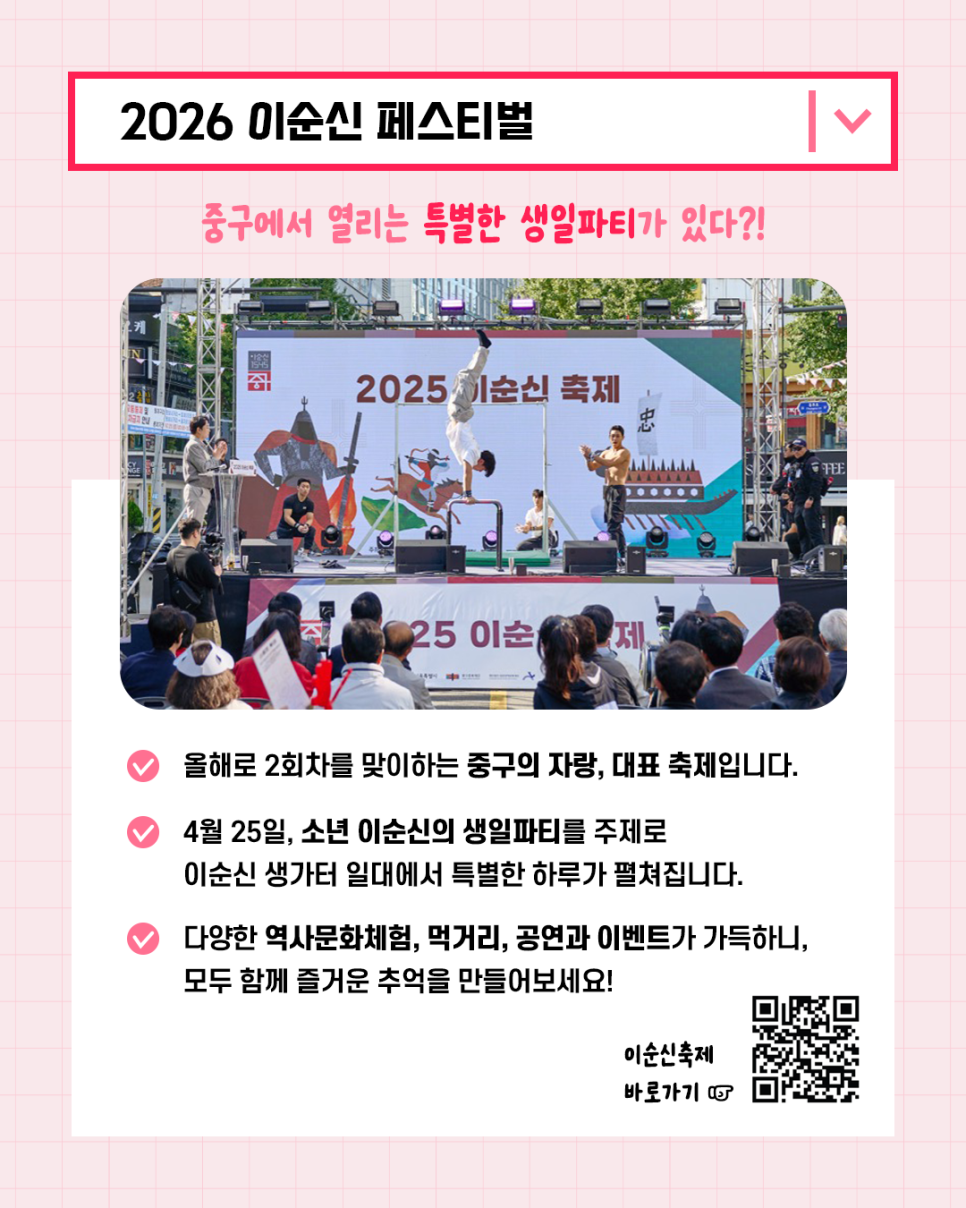 중구에서 누릴 수 있는 특별한 혜택과 정보, 어디까지 알고 계신가요? 👀 내편중구가 준비한 이순신의 도시·K-관광의 중심, 중구를 더 재밌게 즐기는 5가지 방법을 소개합니다! · 4월 25일, 이순신의 생일파티를 신나게 즐기는 축제 ‘2026 이순신 페스티벌’ · 이순신 장군의 스토리가 담긴 우리 동네 유니크한 랜드마크 카페 ‘1545 COFFEE’ · 골목골목 숨은 ...