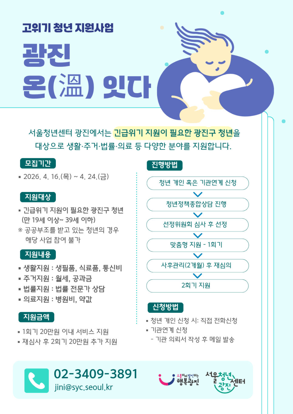 서울청년센터광진<'광진 온(溫)잇다' 4월 참여자 모집>(~4.24) * 고위기 지원사업은 갑작스러운 위기상황으로 생계유지가 곤란한 청년에게 생활·주거·법률·의료 등 서비스를 지원함으로써 위기상황에서 벗어날 수 있도록 하는 사업입니다. 안녕하세요. 서울청년센터 광진입니다. 서울청년센터 광진에서는 긴급위기 지원이 필요한 광진구 청년들을 발굴하여 문제 해결을 지원하고 스스로 자립할 수 있도록 돕는 고위기 지원사업 <광진 온(溫)잇다>를 시행합니다. 공공복지제도의 지원기준에 부합하지 않아 지원을 받지 못하고 있거나, 긴급 위기에 처한 광진구 청년들의 많은 신청 바랍니다. 🌱 신청대상 긴급위기 지원이 필요한 광진구 거주 청년 (만 19세~39세) * 단, 전입신고를 하지 않았더라도 부득이하게 광진구에 거주할 경우 대상에 포함 🌱 4월 모집기간 2026년 4월 16일(목)~4월 24일(금) 🌱 지원내용 생활지원 : 생필품, 식료품, 통신비 주거지원 : 월세, 공과금 법률지원 : 법률 전문가 상담 의료지원 : 병원비, 약값 🌱 지원금액 1) 1회 20만원 이내 1회 서비스 지원 2) 사후관리를 통한 재심사 후 2회기 추가지원 (* 현금 지급은 불가) 🌱 신청 방법 (아래 2가지 中 선택) 1) 청년 개인 신청 : 서울청년센터 광진으로 직접 전화 신청 2) 기관 연계 신청 : 기관에서 의뢰서 작성 후 담당자 메일로 발송 🌱 진행방법 전화 혹은 연계신청 → 청년정책종합상담 진행 → 선정위원회 심사 후 선정 → 1회기 지원 → 사후관리를 통한 재심사 → 2회기 지원 🌱 유의사항 공공부조를 받고 있는 청년의 경우 해당 사업의 참여가 어렵습니다. (*공공부조란? 국민기초생활보장제도, 기타 긴급복지지원제도 등 물질적 / 금전적인 지원을 받는 경우) 🌱 문의 서울청년센터 광진 지니매니저 Tel. 02-3409-3890 / 02-3409-3891 e-mail : jini@syc.seoul.kr