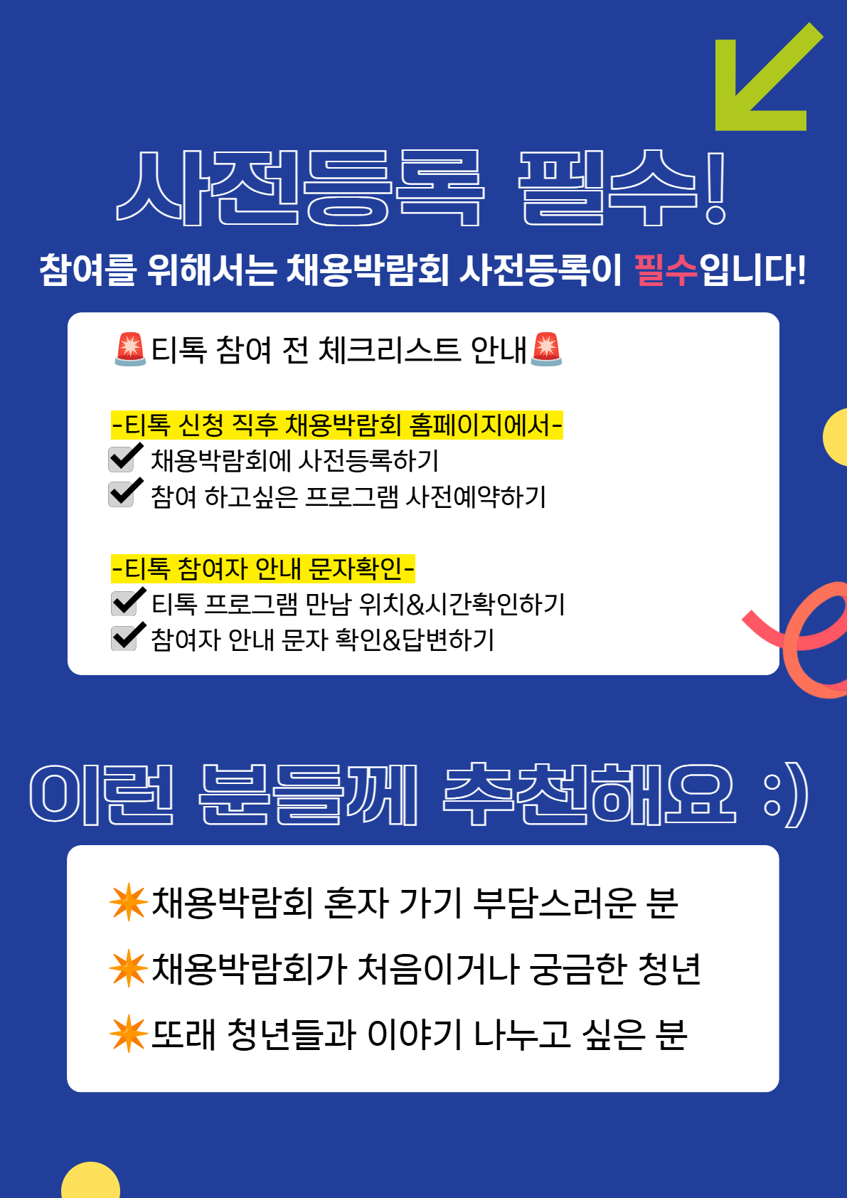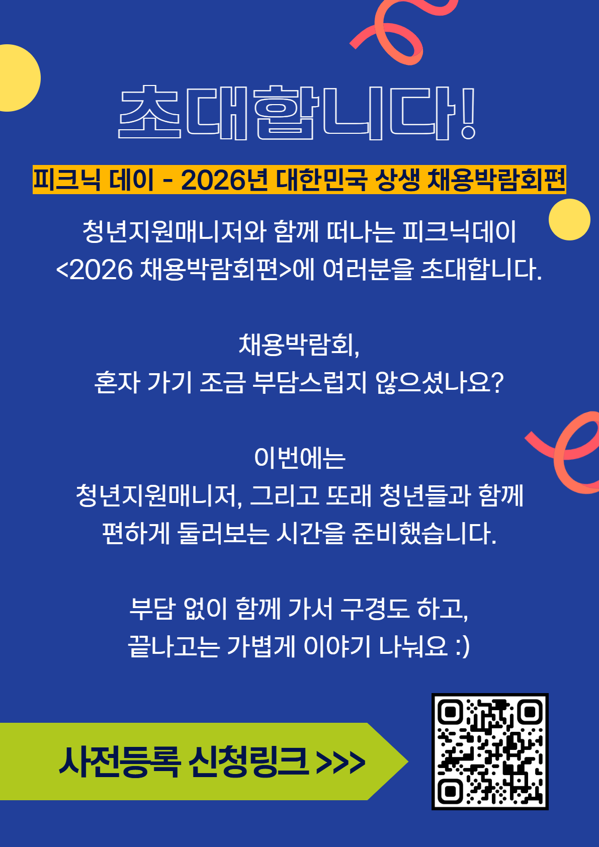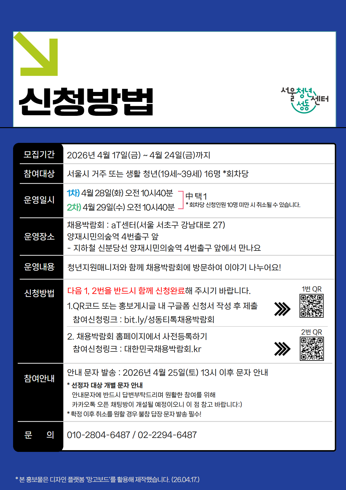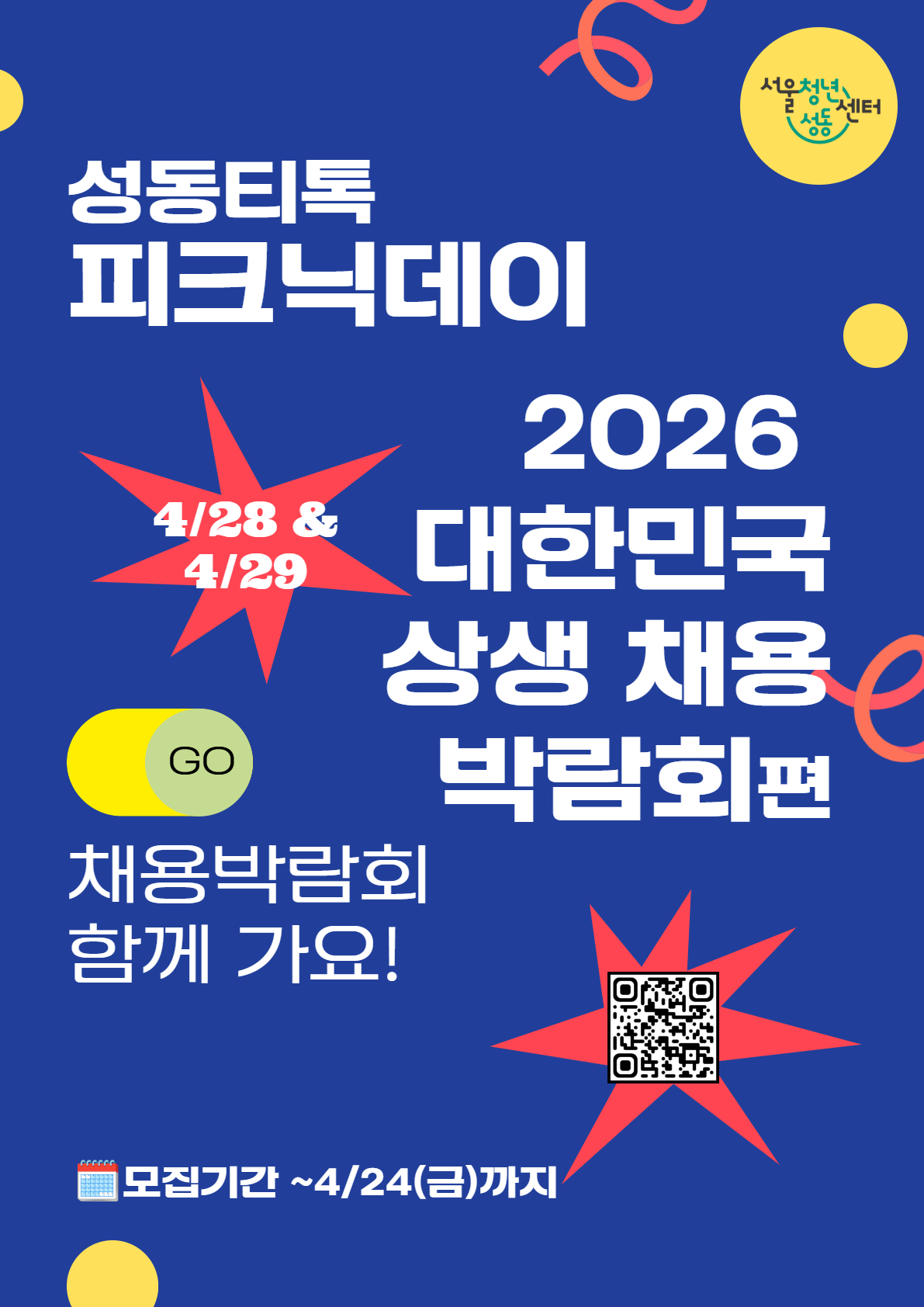 [성동티톡] 피크닉데이 - 2026 대한민국 상생 채용박람회 2026년 성동티톡 <피크닉 데이>가 돌아왔습니다! 이번 4월에 청년지원매니저와 함께 떠나는 '피크닉 데이 - 2026년 대한민국 상생 채용박람회 편'으로 모든 청년 분들을 초대합니다. 채용박람회? 자주 들어봤지만, 어떤 건지 잘 몰라서 고민인 청년 혼자 가기 망설여지는 청년 혼자보다는 청년들과 함께 가고 싶은 청년 누구나 모두 모여, 청년지원매니저랑 같이 채용박람회에 방문하여 어떤 것들이 진행되는 지 구경하고 살펴보아요! 📢이런 청년에게 추천합니다! - 채용박람회가 처음이거나 궁금한 청년 - 채용박람회에 혼자가기는 망설여지는 청년 - 다른 청년과 함께 대화하며 방문하고픈 청년 이러한 활동과 함께 26년 청년정책 정보를 함께 소개합니다. 이번 티톡은 외부 공간인 aT센터에서 진행합니다:) ● 운영 일시 1차) 2026. 4. 28.(화) 10:40 ~ 12:40 2차) 2026. 4. 29.(수) 10:40 ~ 12:40 >>> 1차, 2차 중 택 1 ● 활동 장소 채용박람회 : aT센터(서울 서초구 강남대로 27) 양재시민의숲역 4번출구 앞 - 지하철 신분당선 양재시민의숲역 4번출구 앞에서 만나요 ● 모집 대상 서울시 거주 또는 생활 청년(19세 ~ 39세) 16명 ● 신청기간 및 방법 다음 1, 2번을 반드시 함께 신청완료해 주시기 바랍니다. 1. 본 구글폼 작성 후 제출 2. 채용박람회 홈페이지( https://youthjobfair.co.kr/registration_confirm.php )에서 사전등록하기 - 26.4.24.까지 신청 ●참여자 선정 기준 - 위 1,2번을 모두 진행하여야 참여 가능합니다:) ● 참여 안내 2025.4.25.(토) 13시 이후 참여자 대상 개별 문자 안내 - 만남 장소와 카톡오픈채팅방 참여 안내 등이 있으니 반드시 문자 확인부탁드립니다! ● 문의 서울청년센터 성동 02-2294-6487 / 010-2804-6487