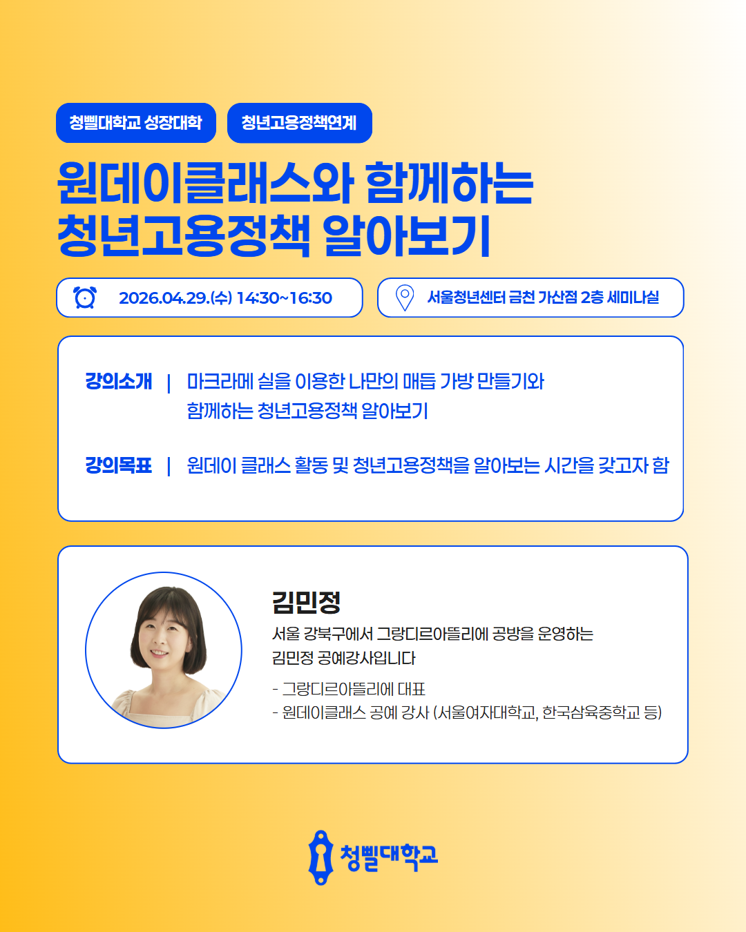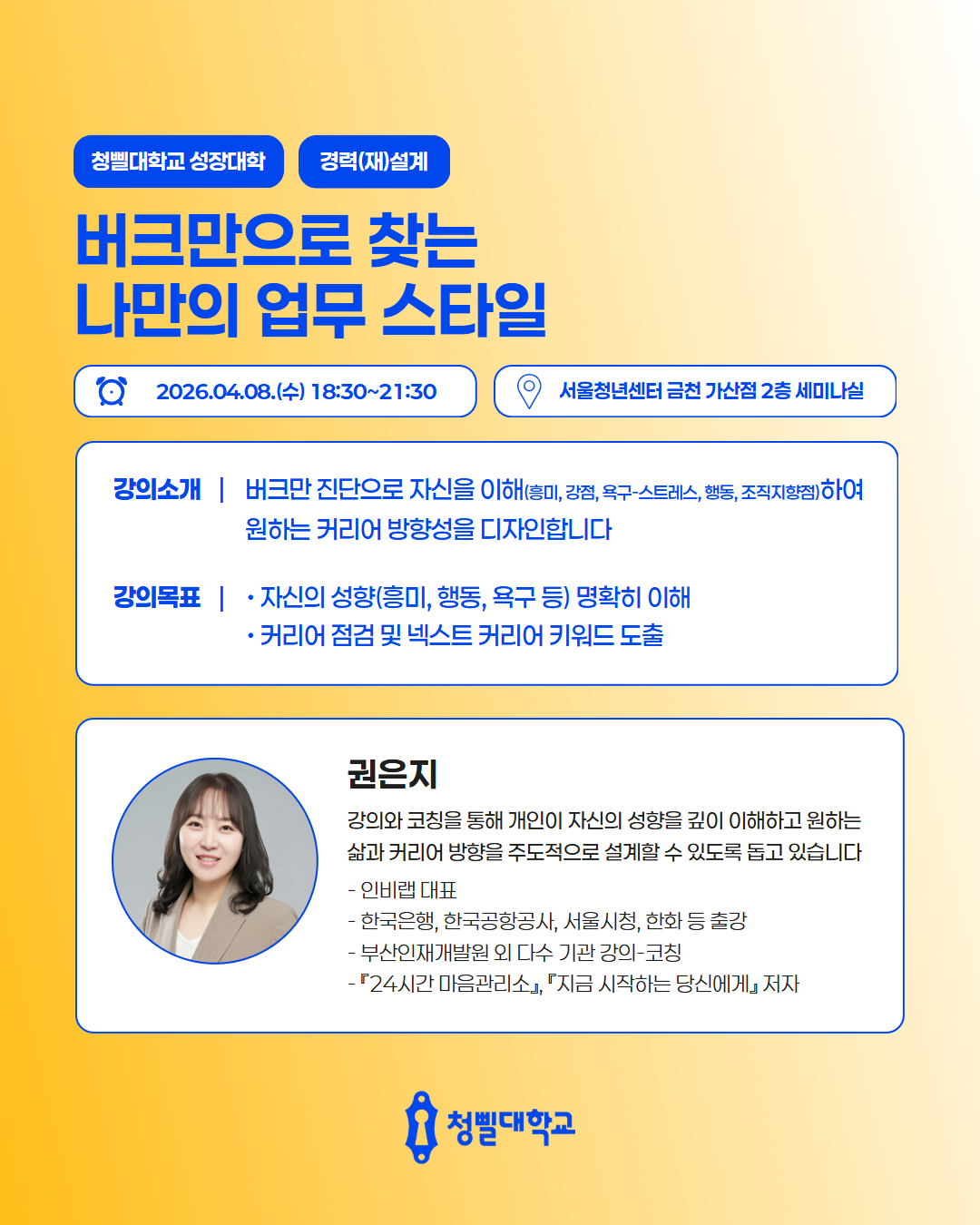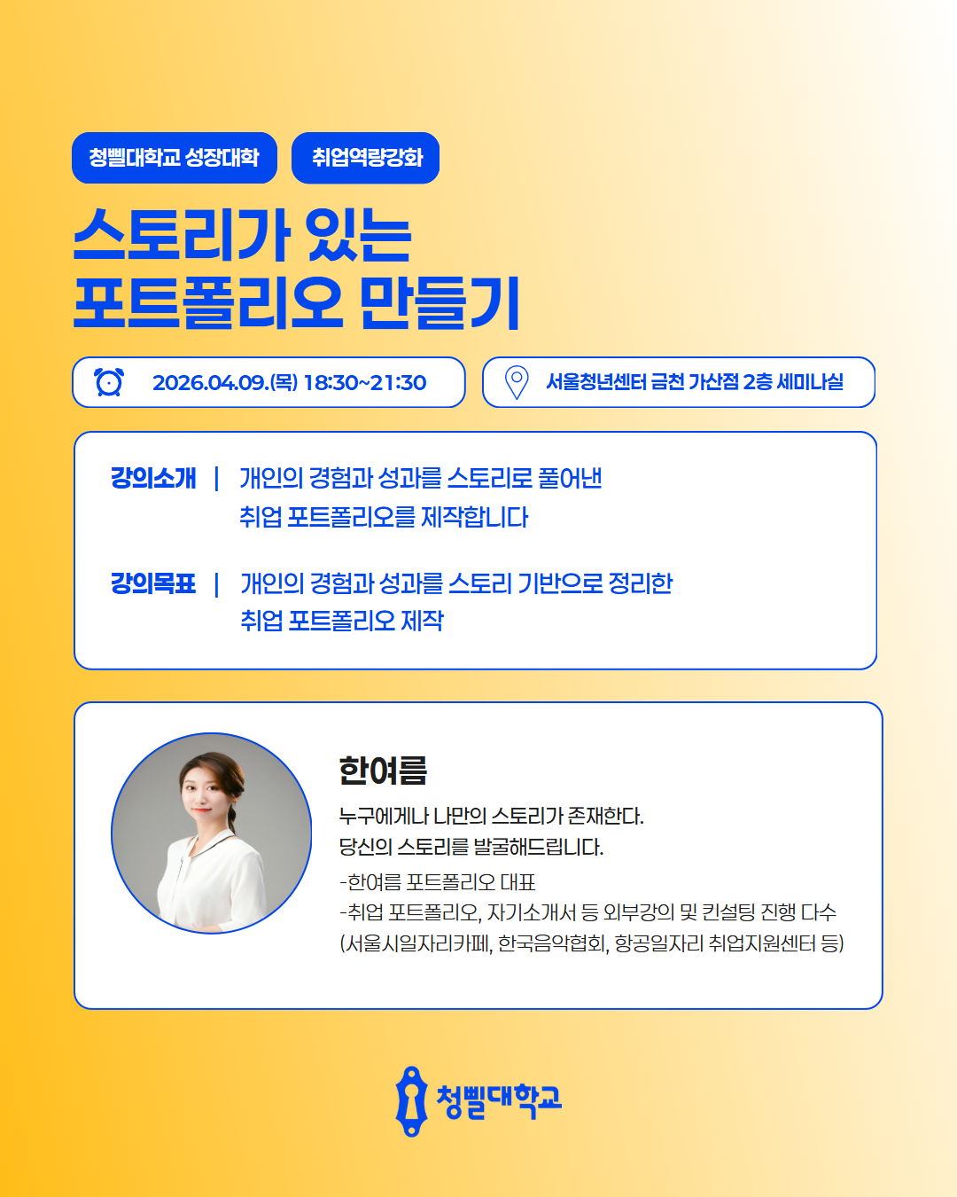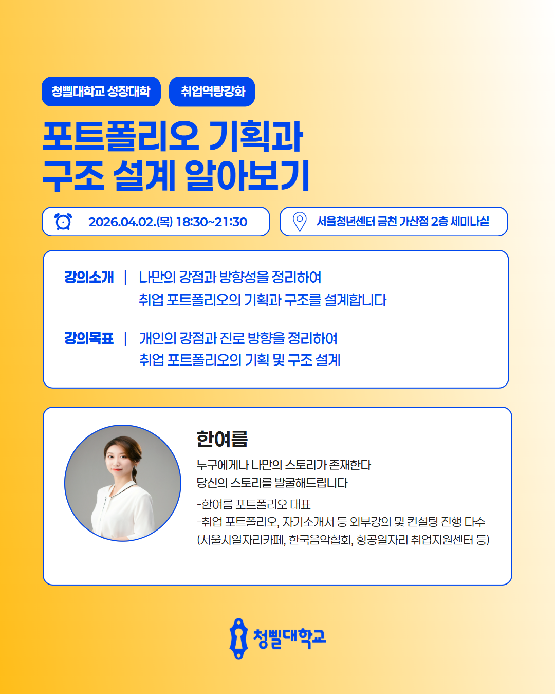 💛2026 청삘대학교 성장대학 4월 프로그램 & 강사진을 소개💛 청삘대학교 성장대학 4월 프로그램 & 강사진을 소개합니다!✨ 📌신청 대상 • 만 19세 이상 ~ 39세 이하 • 구직의사가 있는 미취업 청년 (취업·이직 준비생) 📌모집 기간 • 각 프로그램 정원 도달 시 까지 📌4월 프로그램 안내 • [취업역량강화] 포트폴리오 기획과 구조 설계 알아보기 • [경력설계] 내 안의 가능성 깨우기: 강점 기반 커리어 설계 • [경력설계] 버크만으로 찾는 나만의 업무 스타일 • [취업역량강화] 일잘러를 위한 비즈니스 매너 익히기 • [취업역량강화] 스토리가 있는 포트폴리오 만들기 • [직무역량강화] 커리어 UP! 재취업을 위한 AI 기반 업무 생산성 향상 전략 • [취업역량강화] 취준생을 위한 차별화 된 서류전형 합격 전략 • [취업역량강화] 함께하는 포트폴리오 컨설팅 • [경력설계] TCI 검사를 통한 자기 이해 워크숍 • [취업역량강화] 합격을 부르는 문장만들기_실전 첨삭 클리닉 • [마음돌봄] 지친 나를 위한 회복 클래스, 번아웃에서 벗어나기 • [직무역량강화] 커리어 UP! 재취업을 위한 엑셀 함수 실무 활용 전략 • [청년고용정책연계] 원데이클래스와 함께하는 청년고용정책 알아보기 • [취업역량강화] 자신감을 높일 수 있는 보이스 트레이닝 • [취업역량강화] 합격을 부르는 첫인상 - 면접 퍼스널 컬러 진단 클래스 📌참여 방법 1) 프로그램신청 - 청삘대학교 프로그램 신청 홈페이지를 통해 희망 프로그램 신청 👇청삘대학교 프로그램 신청 홈페이지 https://www.sgunivccbd.com/ 2) 고용24 홈페이지 회원가입 및 초기상담 신청 - 고용24 가입 후 [취업지원 → 청년성장프로젝트] 메뉴 접속 - [서울청년센터 금천 청춘삘딩 초기상담] 프로그램 신청 👇고용24 청년성장프로젝트 https://www.work24.go.kr/wk/v/a/1000/youngGrowIntro.do 3) 초기상담 참여(유선 및 대면 약 20분 내외) - 초기 상담을 통해 개인 상황에 맞는 맞춤형 프로그램을 함께 설계해드립니다😊 📞 02-865-0597 고용24 가입 및 프로그램 신청 후, 순차적으로 연락드릴 예정입니다.