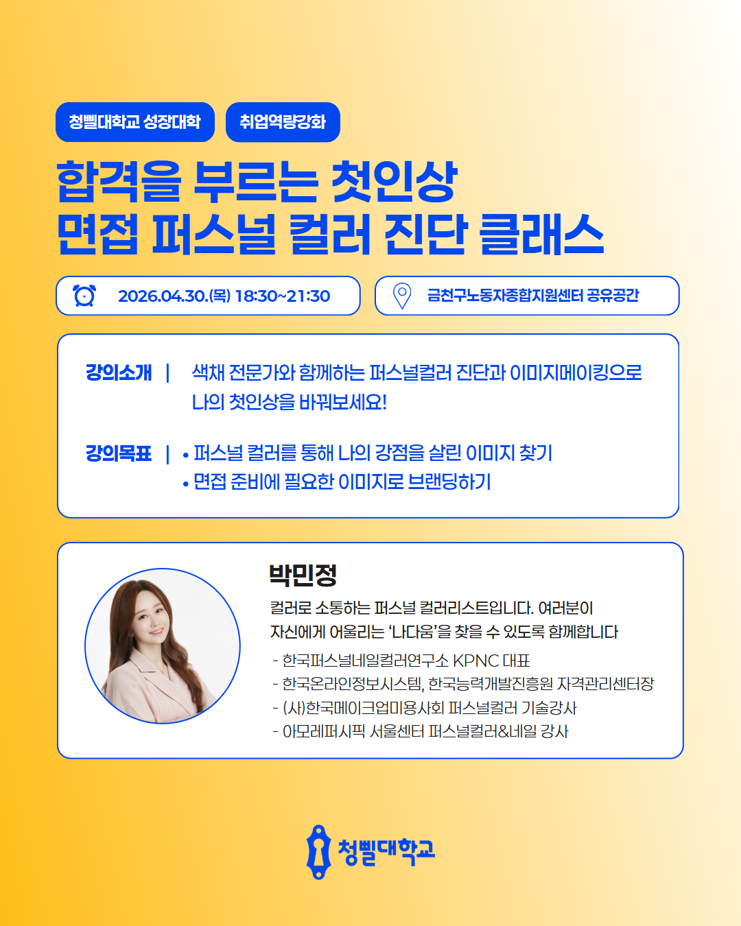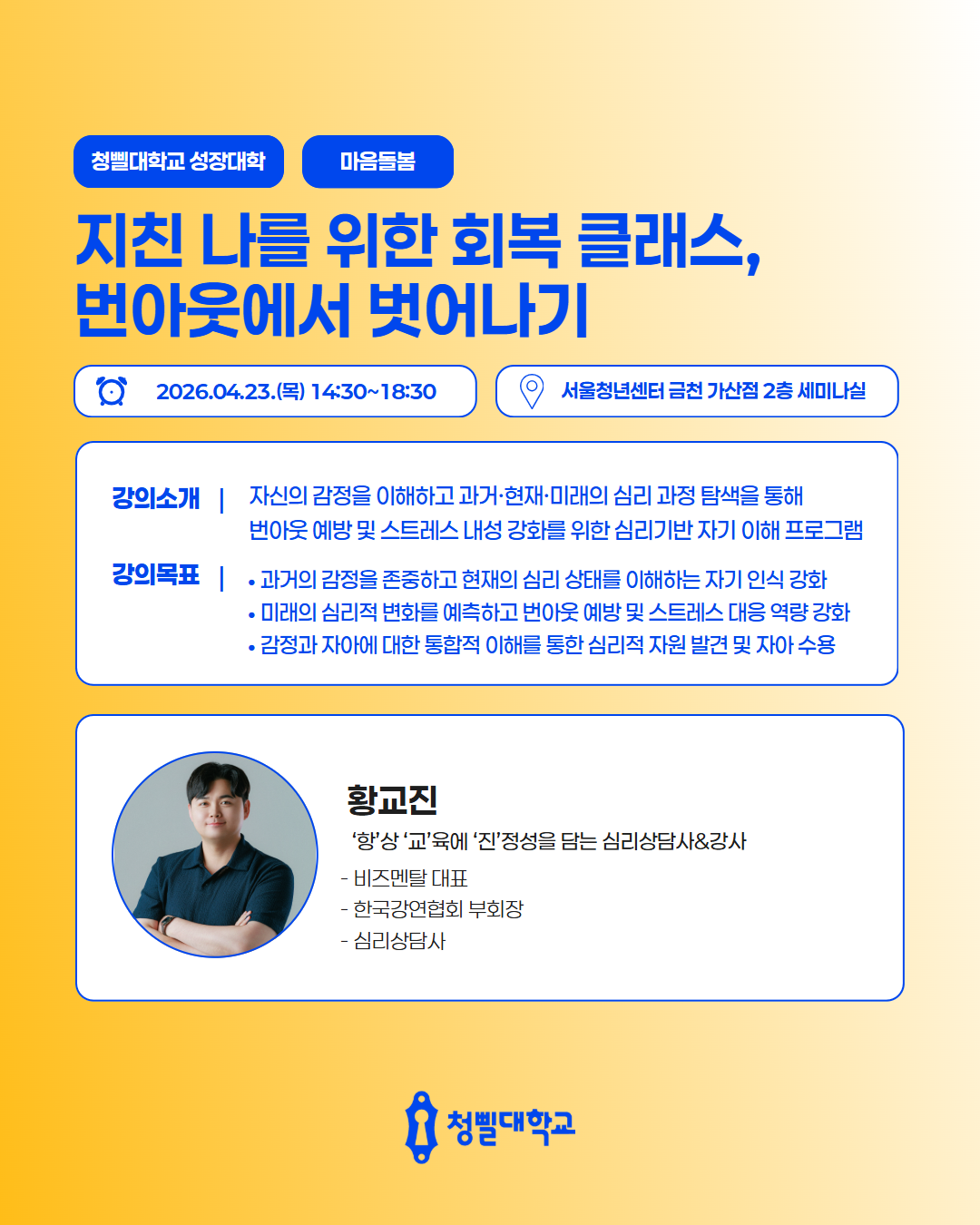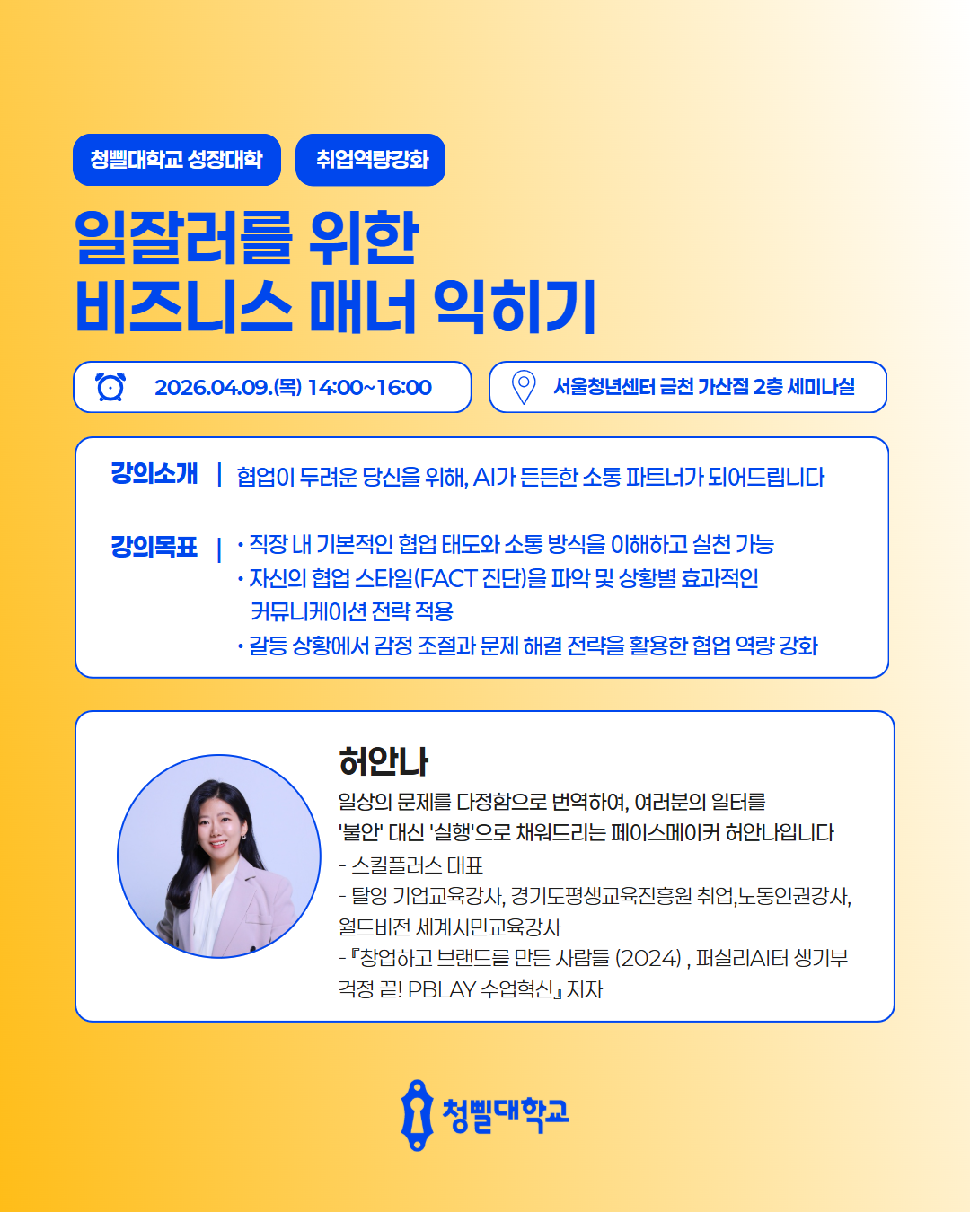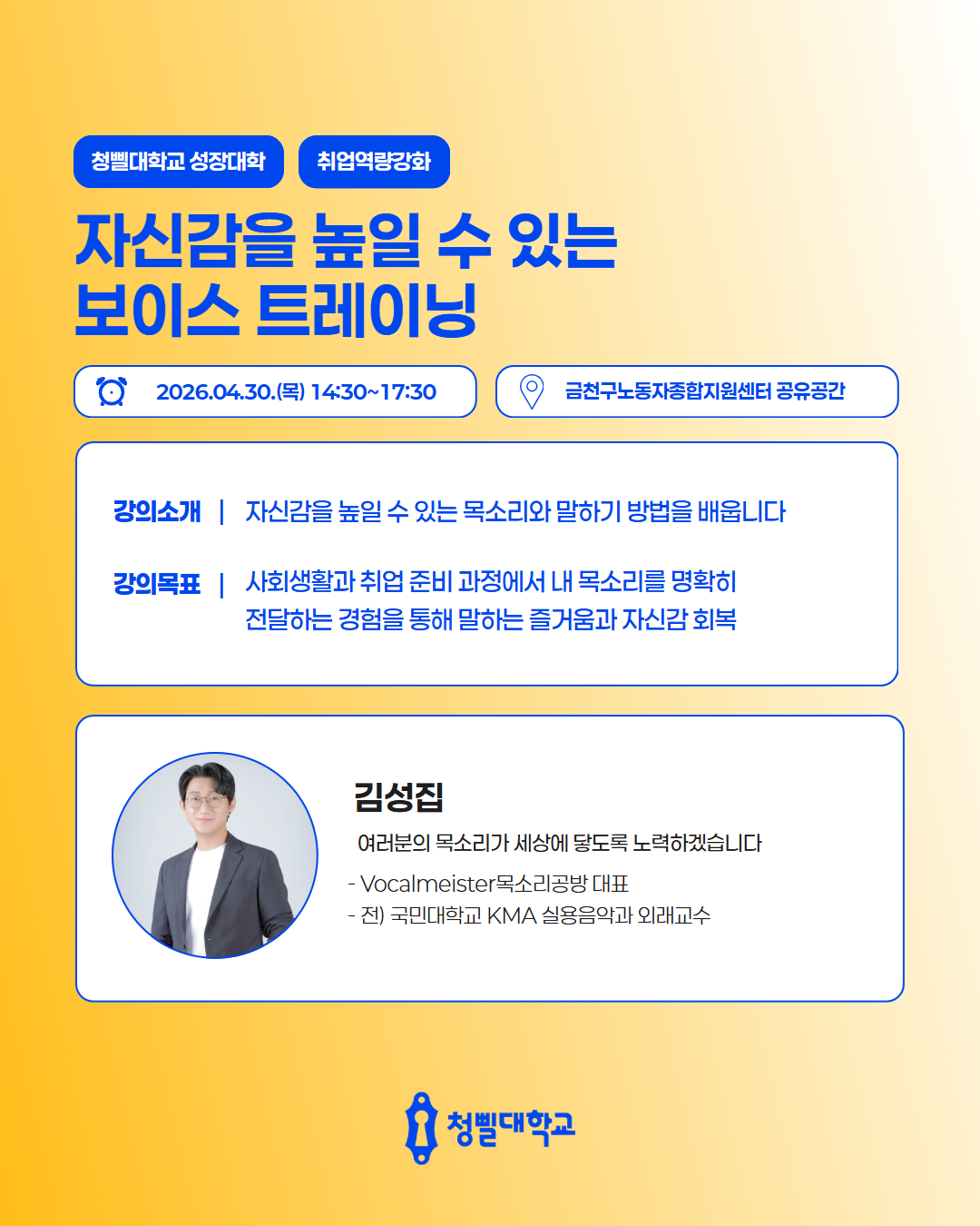 💛2026 청삘대학교 성장대학 4월 프로그램 & 강사진을 소개💛 청삘대학교 성장대학 4월 프로그램 & 강사진을 소개합니다!✨ 📌신청 대상 • 만 19세 이상 ~ 39세 이하 • 구직의사가 있는 미취업 청년 (취업·이직 준비생) 📌모집 기간 • 각 프로그램 정원 도달 시 까지 📌4월 프로그램 안내 • [취업역량강화] 포트폴리오 기획과 구조 설계 알아보기 • [경력설계] 내 안의 가능성 깨우기: 강점 기반 커리어 설계 • [경력설계] 버크만으로 찾는 나만의 업무 스타일 • [취업역량강화] 일잘러를 위한 비즈니스 매너 익히기 • [취업역량강화] 스토리가 있는 포트폴리오 만들기 • [직무역량강화] 커리어 UP! 재취업을 위한 AI 기반 업무 생산성 향상 전략 • [취업역량강화] 취준생을 위한 차별화 된 서류전형 합격 전략 • [취업역량강화] 함께하는 포트폴리오 컨설팅 • [경력설계] TCI 검사를 통한 자기 이해 워크숍 • [취업역량강화] 합격을 부르는 문장만들기_실전 첨삭 클리닉 • [마음돌봄] 지친 나를 위한 회복 클래스, 번아웃에서 벗어나기 • [직무역량강화] 커리어 UP! 재취업을 위한 엑셀 함수 실무 활용 전략 • [청년고용정책연계] 원데이클래스와 함께하는 청년고용정책 알아보기 • [취업역량강화] 자신감을 높일 수 있는 보이스 트레이닝 • [취업역량강화] 합격을 부르는 첫인상 - 면접 퍼스널 컬러 진단 클래스 📌참여 방법 1) 프로그램신청 - 청삘대학교 프로그램 신청 홈페이지를 통해 희망 프로그램 신청 👇청삘대학교 프로그램 신청 홈페이지 https://www.sgunivccbd.com/ 2) 고용24 홈페이지 회원가입 및 초기상담 신청 - 고용24 가입 후 [취업지원 → 청년성장프로젝트] 메뉴 접속 - [서울청년센터 금천 청춘삘딩 초기상담] 프로그램 신청 👇고용24 청년성장프로젝트 https://www.work24.go.kr/wk/v/a/1000/youngGrowIntro.do 3) 초기상담 참여(유선 및 대면 약 20분 내외) - 초기 상담을 통해 개인 상황에 맞는 맞춤형 프로그램을 함께 설계해드립니다😊 📞 02-865-0597 고용24 가입 및 프로그램 신청 후, 순차적으로 연락드릴 예정입니다.