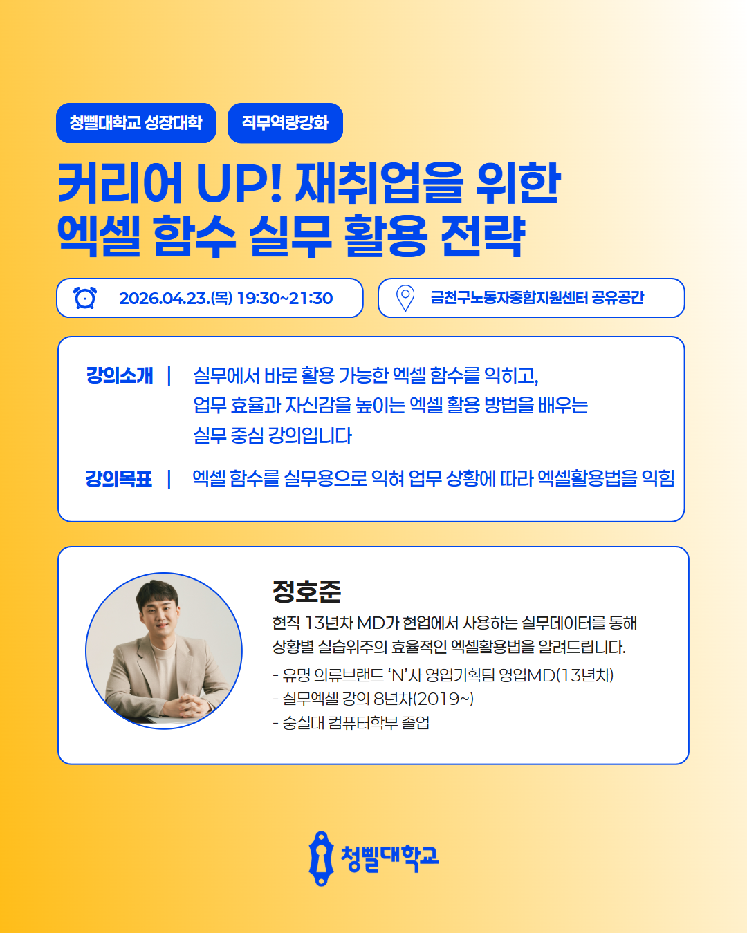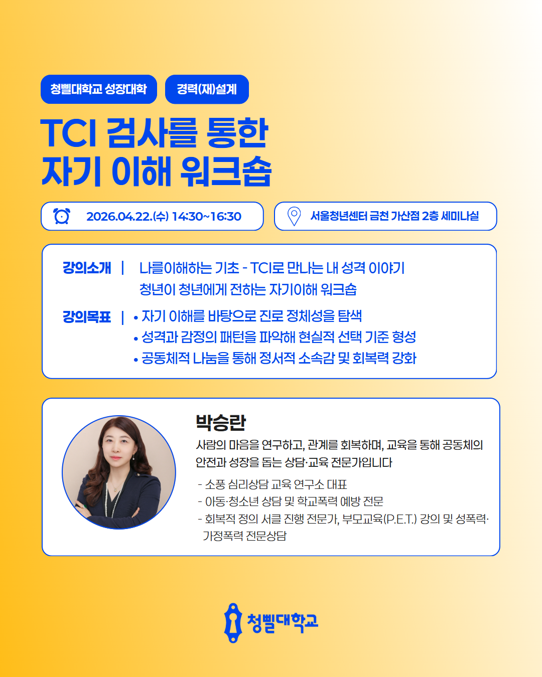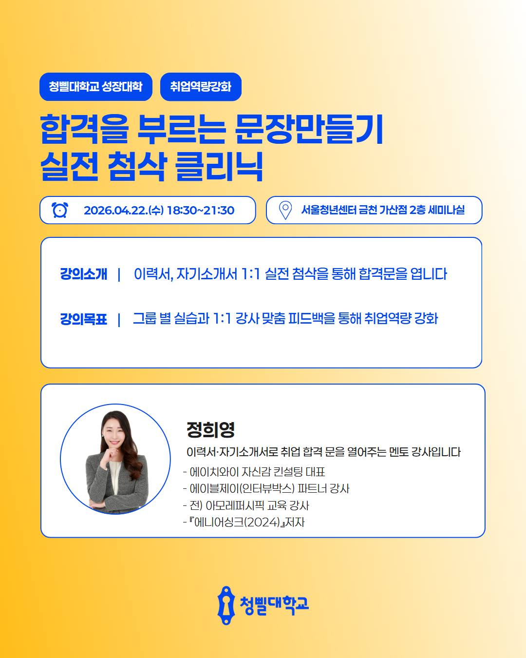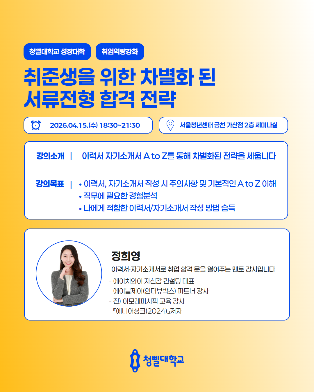 💛2026 청삘대학교 성장대학 4월 프로그램 & 강사진을 소개💛 청삘대학교 성장대학 4월 프로그램 & 강사진을 소개합니다!✨ 📌신청 대상 • 만 19세 이상 ~ 39세 이하 • 구직의사가 있는 미취업 청년 (취업·이직 준비생) 📌모집 기간 • 각 프로그램 정원 도달 시 까지 📌4월 프로그램 안내 • [취업역량강화] 포트폴리오 기획과 구조 설계 알아보기 • [경력설계] 내 안의 가능성 깨우기: 강점 기반 커리어 설계 • [경력설계] 버크만으로 찾는 나만의 업무 스타일 • [취업역량강화] 일잘러를 위한 비즈니스 매너 익히기 • [취업역량강화] 스토리가 있는 포트폴리오 만들기 • [직무역량강화] 커리어 UP! 재취업을 위한 AI 기반 업무 생산성 향상 전략 • [취업역량강화] 취준생을 위한 차별화 된 서류전형 합격 전략 • [취업역량강화] 함께하는 포트폴리오 컨설팅 • [경력설계] TCI 검사를 통한 자기 이해 워크숍 • [취업역량강화] 합격을 부르는 문장만들기_실전 첨삭 클리닉 • [마음돌봄] 지친 나를 위한 회복 클래스, 번아웃에서 벗어나기 • [직무역량강화] 커리어 UP! 재취업을 위한 엑셀 함수 실무 활용 전략 • [청년고용정책연계] 원데이클래스와 함께하는 청년고용정책 알아보기 • [취업역량강화] 자신감을 높일 수 있는 보이스 트레이닝 • [취업역량강화] 합격을 부르는 첫인상 - 면접 퍼스널 컬러 진단 클래스 📌참여 방법 1) 프로그램신청 - 청삘대학교 프로그램 신청 홈페이지를 통해 희망 프로그램 신청 👇청삘대학교 프로그램 신청 홈페이지 https://www.sgunivccbd.com/ 2) 고용24 홈페이지 회원가입 및 초기상담 신청 - 고용24 가입 후 [취업지원 → 청년성장프로젝트] 메뉴 접속 - [서울청년센터 금천 청춘삘딩 초기상담] 프로그램 신청 👇고용24 청년성장프로젝트 https://www.work24.go.kr/wk/v/a/1000/youngGrowIntro.do 3) 초기상담 참여(유선 및 대면 약 20분 내외) - 초기 상담을 통해 개인 상황에 맞는 맞춤형 프로그램을 함께 설계해드립니다😊 📞 02-865-0597 고용24 가입 및 프로그램 신청 후, 순차적으로 연락드릴 예정입니다.