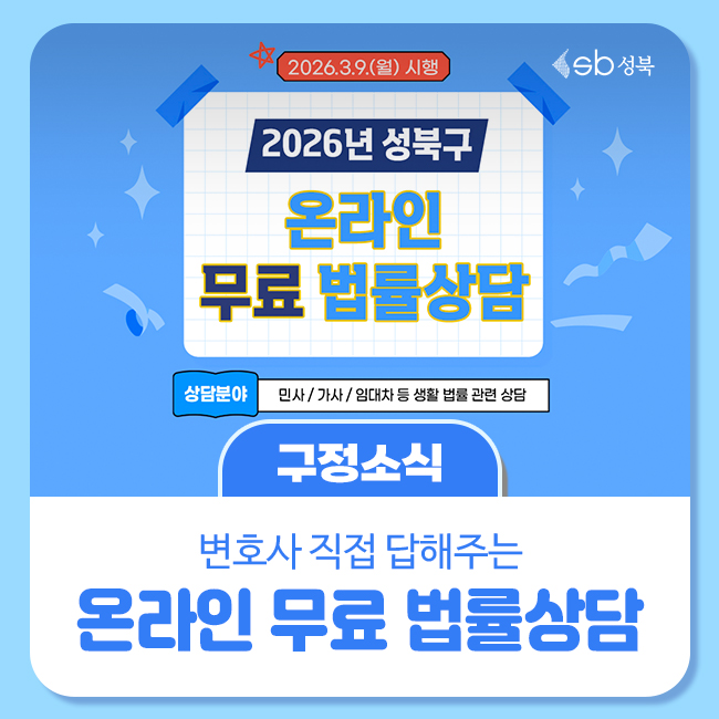 안녕하세요 성북누리입니다. 일상 생활 속 갑작스럽게 법률 관련 문제가 생겨 당황스러운 순간이 종종 있으실 텐데요. 이런 고민을 해결하기 위해 성북구에서 온라인 무료 법률 상담을 시작합니다! 성북구민이 알아두면 좋을 온라인 무료 법률 상담의 이용 방법을 소개드립니다⚖️✨💻 2026 성북구 온라인 무료 법률 상담 📆 시작일시: 2026. 3. 9.(월) 시행 🙋♀️ 이용대상: 성북구청 홈페이지에 회...