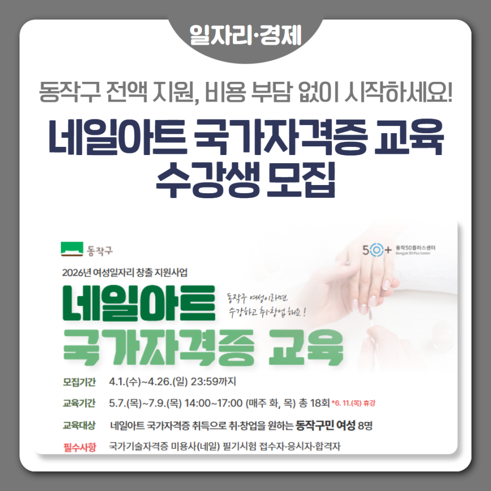 새로운 분야를 배우고 자격증으로 취업 기회를 넓히고 싶다면 지금이 기회! 동작구에서 전액 지원하는 💅 실무 중심 네일아트 자격증 교육을 준비했습니다. 이론부터 실습까지 체계적으로 배우고 새로운 취업 기회를 만들어보세요 👀💛 동작구 전액 지원! 2026년 네일아트 국가자격증 교육 수강생 모집 📅 모집기간: 2026.4.1.(수) ~ 4.26.(일) 23:59까지 👥 모집...