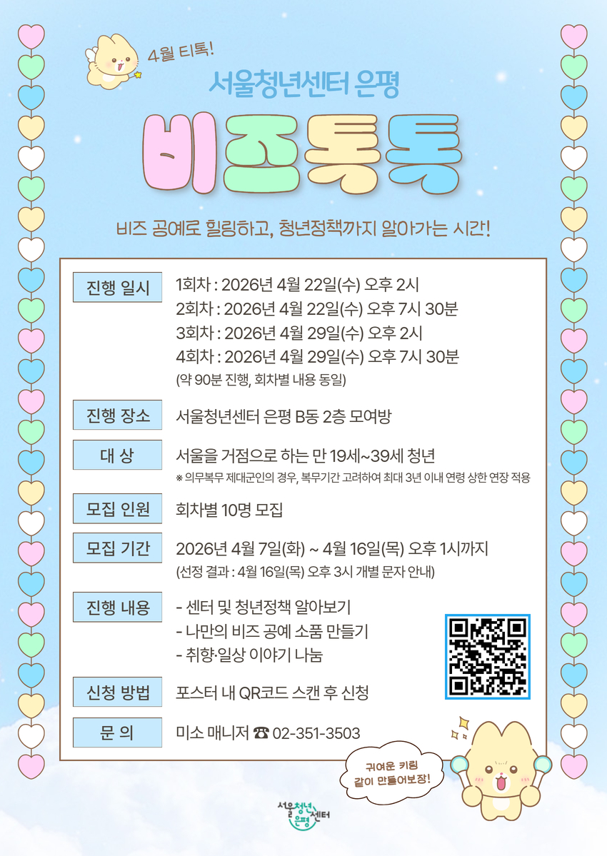 서울청년센터 은평 4월 티톡 <비즈톡톡> 참여자를 모집합니다!✨ 서울청년센터 은평에서 비즈 공예로 나만의 키링, 스트랩, 팔찌를 만들어보는 시간 을 준비했습니다 🌸 반짝이는 비즈를 하나씩 고르고, 취향을 담아 소품을 만들다 보면 어느새 일상의 스트레스는 내려놓고 소소한 즐거움을 느끼는 시간이 될 거예요 🙂 이번 4월 티톡에서는 비즈 공예 활동과 함께 일상 이야기, 취향 이야기까지 💬 가볍게 만들고, 편하게 나누며 청년정책 정보도 자연스럽게 알아가요! 💬 티톡이란? 청년지원매니저가 준비한 주제로 청년들이 모여 이야기하고 활동하며 청년정책을 자연스럽게 알아가는 프로그램입니다! ✔️ 이런 분께 추천해요! - 요즘 소소한 취미나 힐링 시간이 필요하신 분 - 손으로 만드는 활동을 좋아하시는 분 - 나만의 키링·팔찌를 만들어보고 싶은 분 - 청년정책 정보를 부담 없이 알아보고 싶은 청년 👥대상 서울을 거점으로 하는 만 19세~39세 청년 ※ 은평구 거주·활동 청년 우대 ※ 의무복무 제대군인의 경우, 복무기간 고려하여 최대 3년 이내 연령 상한 연장 적용 📅일시 1회차 2026.4.22(수) 14:00 2회차 2026.4.22(수) 19:30 3회차 2026.4.29(수) 14:00 4회차 2026.4.29(수) 19:30 (약 90분 진행) ※ 회차별 내용 동일 ※3회차 신청 인원이 없어 해당 회차 폐지 양해 부탁드립니다. 📍장소 서울청년센터 은평 B동 2층 모여방 🧵활동 내용 - 센터 및 청년정책 안내 - 비즈 공예 소품 만들기 (키링·스트랩·팔찌 등 자유 제작) - 취향·일상을 주제로 한 가벼운 대화 - 진로·취업 및 이직·경력개발 정보 안내 📌모집 인원 회차당 10명 📌모집 기간 2026.4.7(화)~4.16(목) 오후 1시까지! 📌신청 방법 서울시 공공서비스예약을 통해 신청 https://yeyak.seoul.go.kr/web/reservation/selectReservView.do?rsv_svc_id=S260402164336179993 📌선정 안내 4.16(목) 오후 3시 개별 문자 안내 - ‘010-8375-3711’로 발송되는 문자 꼭 확인! 📲 - 문자로 안내되는 사전 설문조사까지 완료해야 최종 참여 확정 🔶안내 사항 - 프로그램 시작 후 15분 이상 지각 시 참여가 제한될 수 있습니다. - 무단 불참 시, 향후 프로그램 참여에 제한이 있을 수 있습니다. - 센터 내 주차는 불가 하며, 인근 유료주차장 이용을 부탁드립니다. - 프로그램 진행 중 기록 및 홍보 목적의 사진 촬영 이 진행됩니다. 🔸문의 서울청년센터 은평 미소 매니저 ☎ 02-351-3503 봄처럼 가볍고 반짝이는 시간 🌸 서울청년센터 은평에서 함께해요!