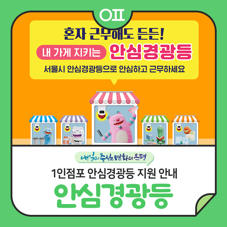 혼자 근무해도 든든! 내 가게 지키는 안심경광등 신청하세요!! 🚨 안전에 취약한 1인 점포를 대상으로 안심경광등을 지원합니다. ✔️ 모집기간 2026.2.13.(금) - 연중 상시 ✔️ 대상 서울시 내 1명이 상시 근무하는 점포 ※ 직원이 2인 이상이더라도 교대근무 등으로 1인이 근무하는 시간대가 있다면 신청 가능 ✔️ 지원내용 안심이총괄센터 연계 긴급신고가 가능한 안심경광등 지원 ...