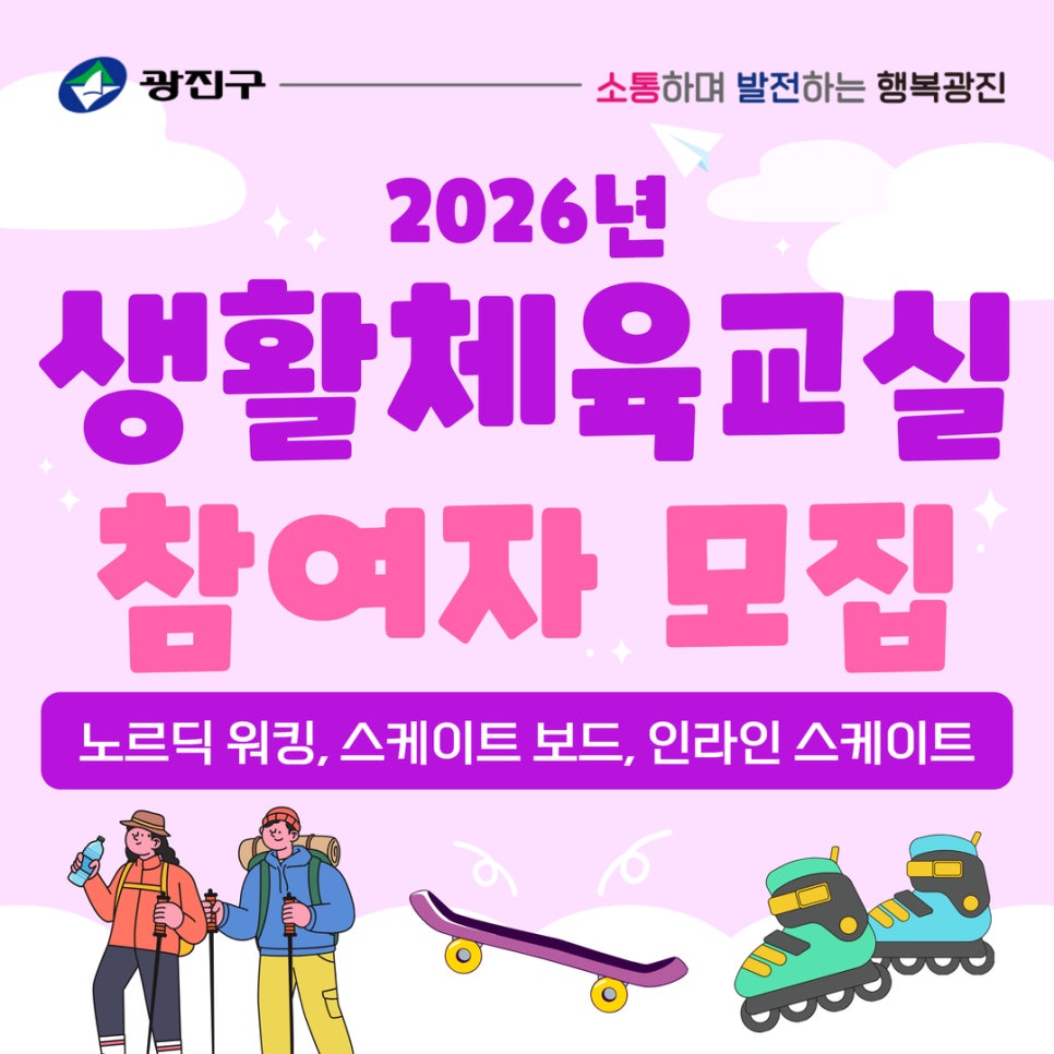 광진구에서는 구민 여러분의 건강 증진과 활기찬 일상생활을 위해 생활체육교실을 운영하고 있습니다. 이번은 중장년층 및 초중고 학생 대상 프로그램으로 노르딕 워킹, 스케이트 보드, 인라인 스케이트 참여자를 모집합니다. 관심 있는 프로그램에 참여하셔서 건강한 일상을 보내시기 바랍니다! 프로그램 안내 종목 내용 노르딕 워킹 - 운영: 4. 3.~ 6. 19.(금) 13:30~15:00 -...