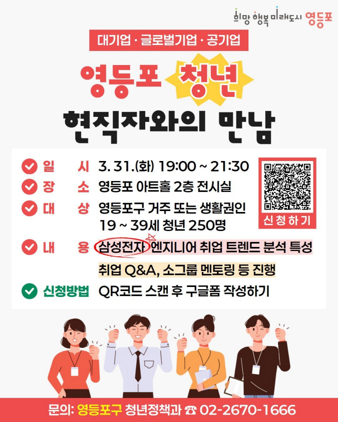 취업을 준비하다 보면 "현직자에게 직접 이야기를 들어볼 기회가 있었으면 좋겠다"는 이런 생각 한 번쯤은 해보셨을 텐데요🤔 영등포 청년들을 위해 대기업·글로벌기업·공기업 현직자와 직접 만나 이야기할 수 있는 자리가 마련되었습니다. 바로 영등포 청년 '현직자와의 만남' 프로그램입니다! 취업 준비에 도움이 되는 취업 특강부터 Q&A, 소그룹 멘토링까지 진행된다고 하니 관심 있는 ...