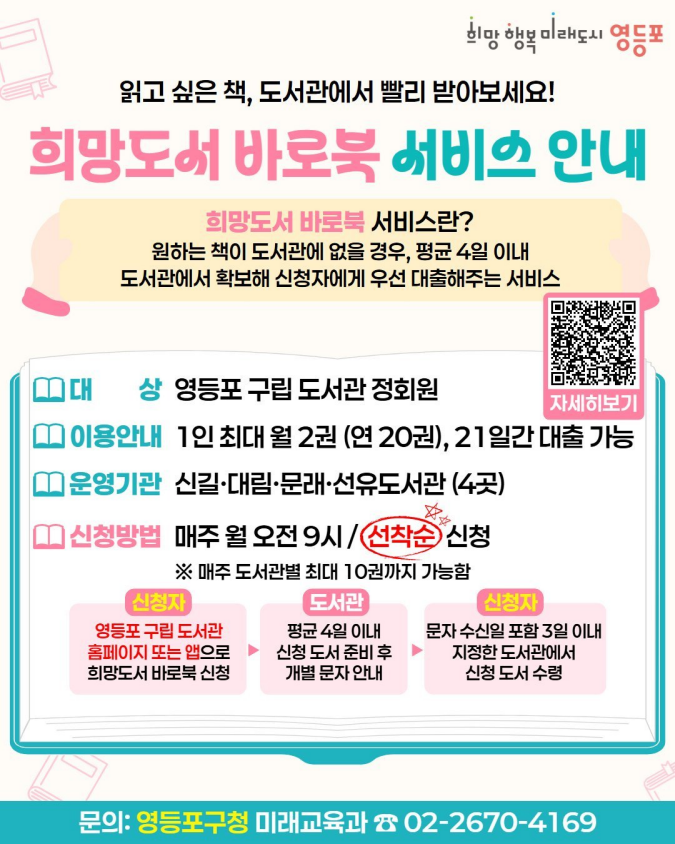 읽고 싶은 책이 있는데 도서관에 없어서 아쉬웠던 적 있으셨죠?🥲 이럴 때 딱 필요한 서비스! 바로 희망도서 바로북 서비스입니다📚✨📖 희망도서 바로북 서비스란? 기존 희망도서 신청 서비스는 도서관에 없는 책을 신청하면 책을 사고 등록하는 절차 때문에 평균 2 ~ 3주가 소요됐습니다😭 하지만 이번에 새롭게 추가된 희망도서 바로북 서비스는 원하는 책이 도서관에 없을 경우 평균 4...