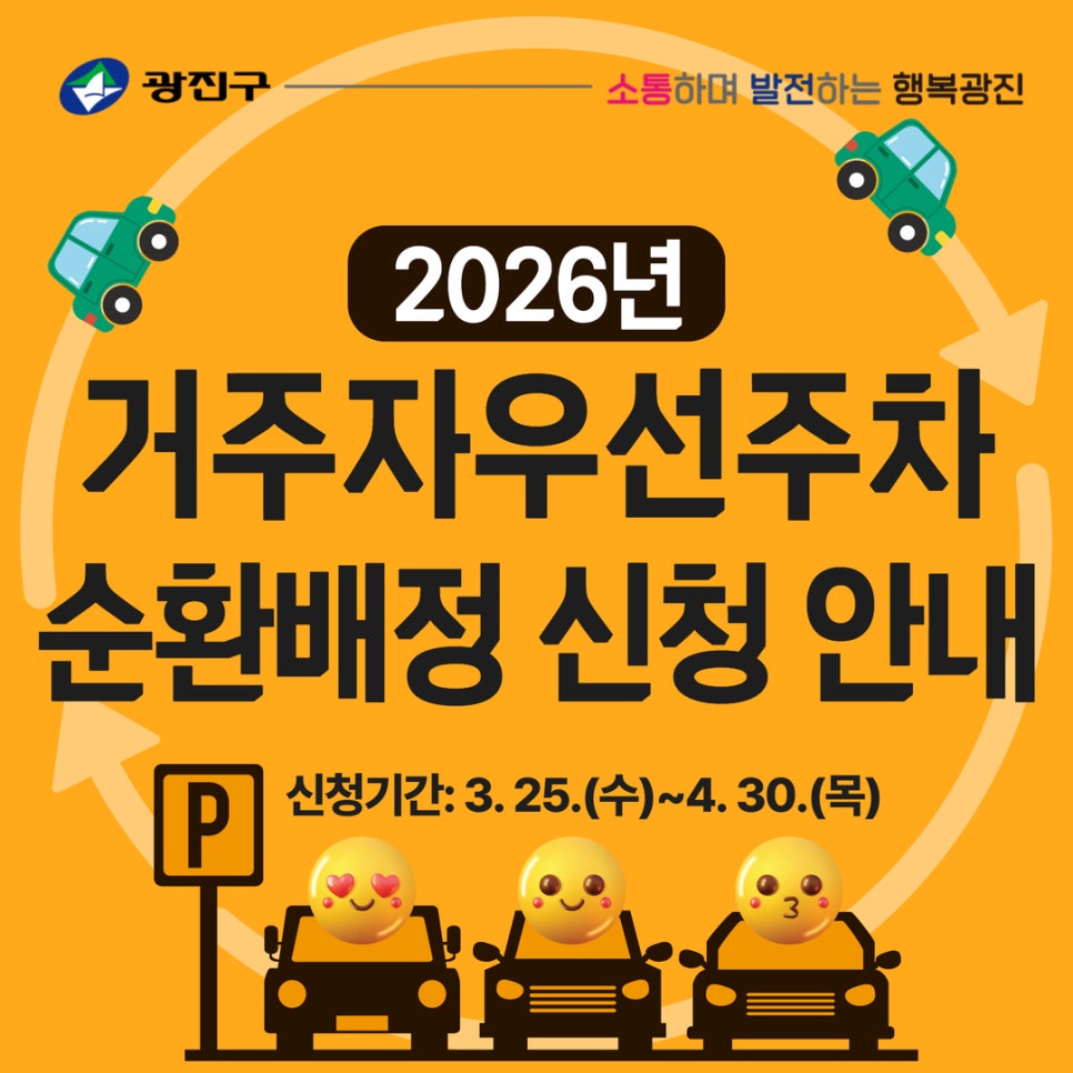2026년 거주자우선주차 순환배정 신청이 오늘부터 시작되었습니다! 이번에 선정되면 2026년 7월 1일부터 1년간 안정적으로 주차면을 이용하실 수 있습니다.🙋🏻♂️ 대상 · 광진구에 주민등록이 되어 있는 거주자 및 사업자(사업장의 상근자) ※ 주민등록상 1가구 1차량만 배정 가능합니다. 📅 신청기간 · 3. 25.(수)~4. 30.(목) ✍🏻 신청방법 · 광진구시설관리공단 ...
