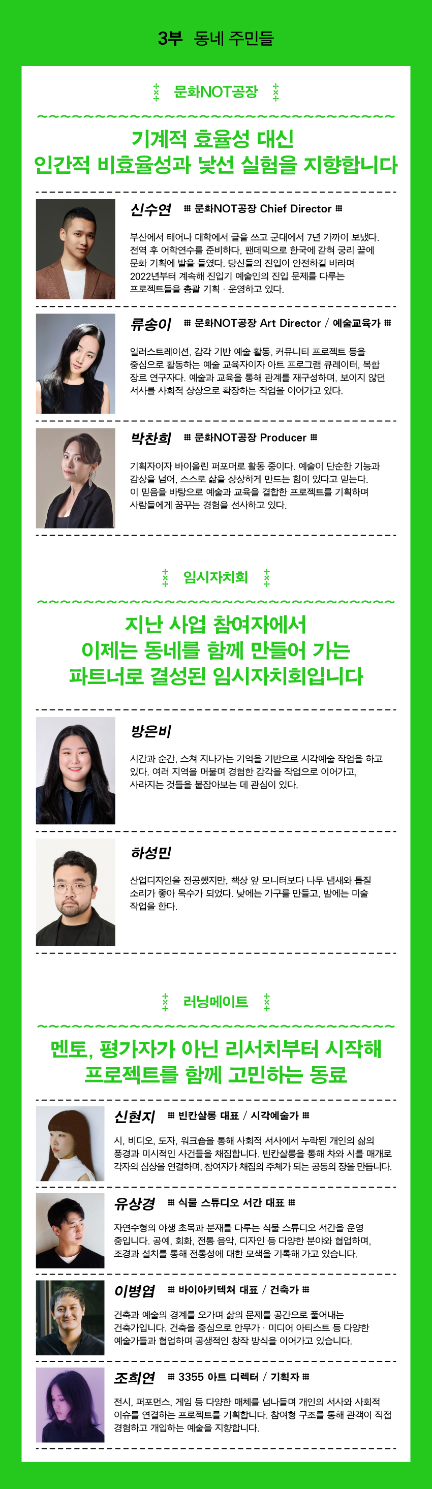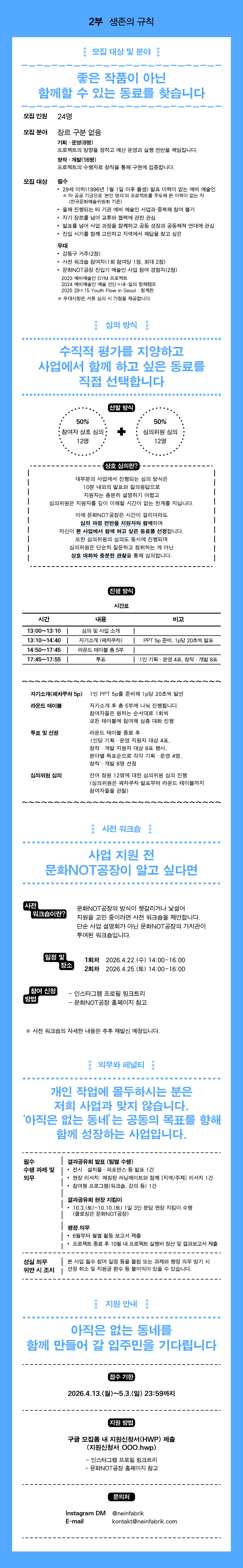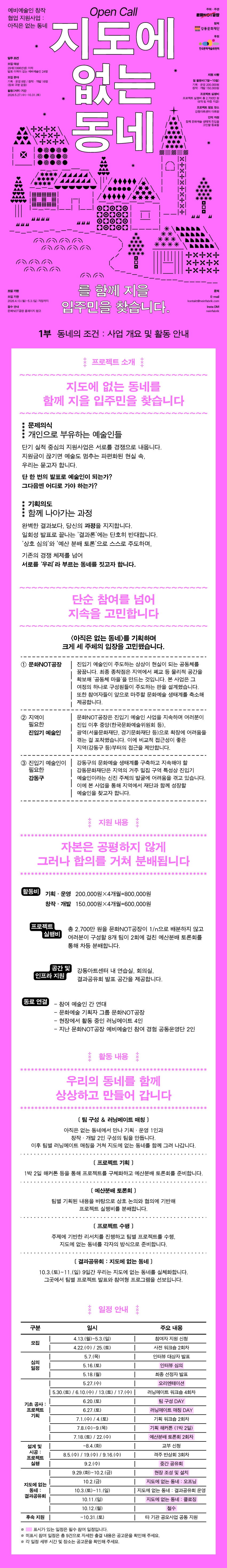 <지도에 없는 동네>를 함께 지을 입주민을 찾습니다. 우리는 좋은 작품이 아닌 함께할 수 있는 동료를 찾습니다. 모집인원: 24명 모집분야: 장르 구분 없음 (기획운영 8명 / 창작개발 16명) 모집대상: 29세 이하(1996년 1월 1일 이후 출생) 발표 이력이 없는 예비 예술인 우대사항: 강동구민, 사전 워크숍 참가 등 모집기간: 2026년 4월 13일(월) ~ 5월 3일(일)