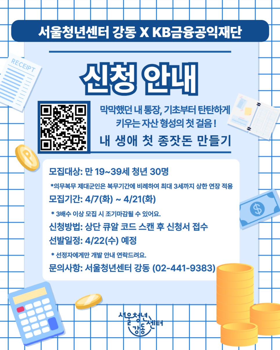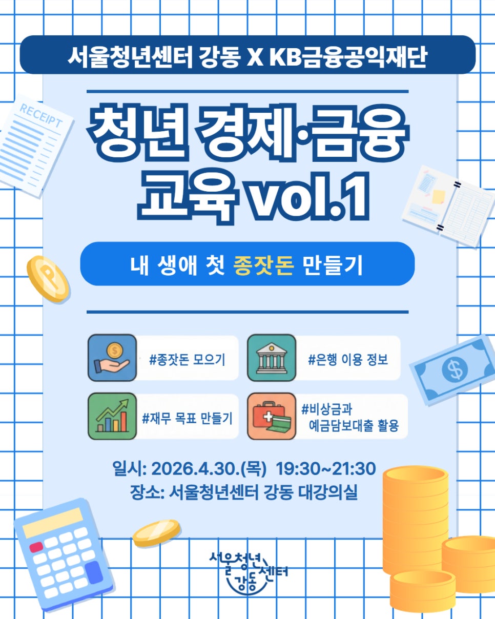 서울청년센터 강동 X KB금융공익재단 <청년 경제·금융 교육> vol.1 내 생애 첫 종잣돈 만들기 참여자 모집 "분명히 월급을 받았는데, 다 어디로 갔지? 🤔" "저축은 하고 싶은데, 종잣돈은 어떻게 모으는 걸까?" 막막했던 내 통장, 기초부터 탄탄하게! 자산을 불리는 첫걸음을 서울청년센터 강동과 시작하세요. 🚀 ✨ 이번 강의, 왜 들어야 할까요? 🟦 #종잣돈_모으기 : 내 생애 첫 목돈 마련을 위한 실전 전략! 🟩 #은행_이용_정보 : 알고 쓰면 돈이 되는 똑똑한 은행 활용법 🟨 #재무적_목표_만들기 : 막연한 꿈이 아닌, 실현 가능한 플랜 짜기 🟥 #예금담보대출_활용 : 비상 시에도 내 돈을 지키는 슬기로운 금융 팁 😃 참여자 상세 조건 - (필수) 4/7 공고일 기준, 만 19세 이상~39세 이하 청년 ※연령연장: 의무복무 제대군인은 복무기간에 비례하여 최대 3세까지 상한 연장 적용 - (우대) 강동·송파 거주 또는 생활 청년 📆 교육 안내 일시: 2026. 4. 30.(목) 19:30~21:30 장소: 서울청년센터 강동 대강의실 📝 신청 방법 : 이미지 내 QR코드 스캔 또는 하단 링크 접수! > [서울청년센터 강동] 클래스 신청 https://youth.seoul.go.kr/youngtech/cls/list 📆신청 기간 : 4/7(화) ~ 4/21(화) 23:59까지 🔔참여자 선정 : 4/22(수) 오후 중 선정자에 한해 개별 안내 💥미선정자에게는 별도로 안내해 드리지 않습니다. 📱채팅 문의 - 카카오톡 '서울청년센터 강동' 채널을 통해 채팅 문의 가능합니다. ▶ http://pf.kakao.com/_GQxjUxb - 문의 시 프로그램명과 참여자분의 성함을 함께 말씀해 주세요!😀 * 문의 가능 시간 : 월~금 10:00 ~ 22:00 / 토 10:00 ~ 17:00 / 일, 공휴일 휴무