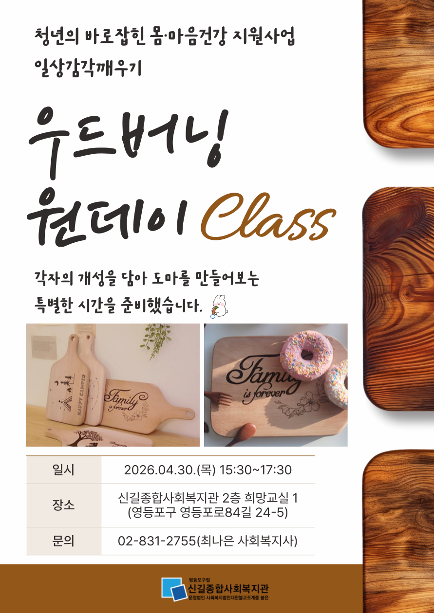 [우드버닝 원데이클래스] 나무도마 위에 나만의 문장이나 그림을 새기며 나에게 집중해보는 시간을 마련했습니다. ★ 나만의 문장 또는 그림 선택하기 → 좋아하는 말, 위로가 되는 문장, 간단한 그림 등을 골라 나를 표현해봐요 ★ 천천히 새기기 → 나무를 태워 선을 그리며 마음을 차분하게 해봐요 ★ 세상에 하나뿐인 나만의 도마 → 내가 직접 만든 도마를 일상생활 속에서도 사용해봐요 ○ 일시: 2026.04.30.(목) 15:30~17:30 ○ 장소: 신길종합사회복지관 2층 희망교실 1 (영등포구 영등포로84길 24-5) ○ 모집: 15명(선착순) ※ 신청자가 15명 이상일 경우 참여율을 고려하여 선정할 예정입니다. 문의 기관) 02-831-2755 (최나은 사회복지사) 직통) 070-4088-0813