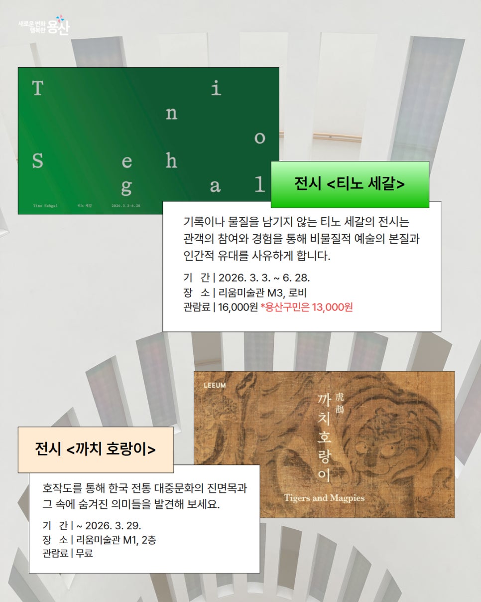 용산에서 예술 감성 충전하기...zip 1. 페이스 갤러리 <Body as Thought> 한국 행위 미술의 거장 이건용 작가의 활동 50주년 전시가 한남동 페이스 갤러리에서 열립니다. 3월 7일 토요일 오후 3시에는 작가의 라이브 퍼포먼스를 직접 볼 수 있는 기회까지! 기간 | 2026. 2. 5. ~ 3. 28. 장소 | 페이스갤러리(이태원로 267) 관람료 ...
