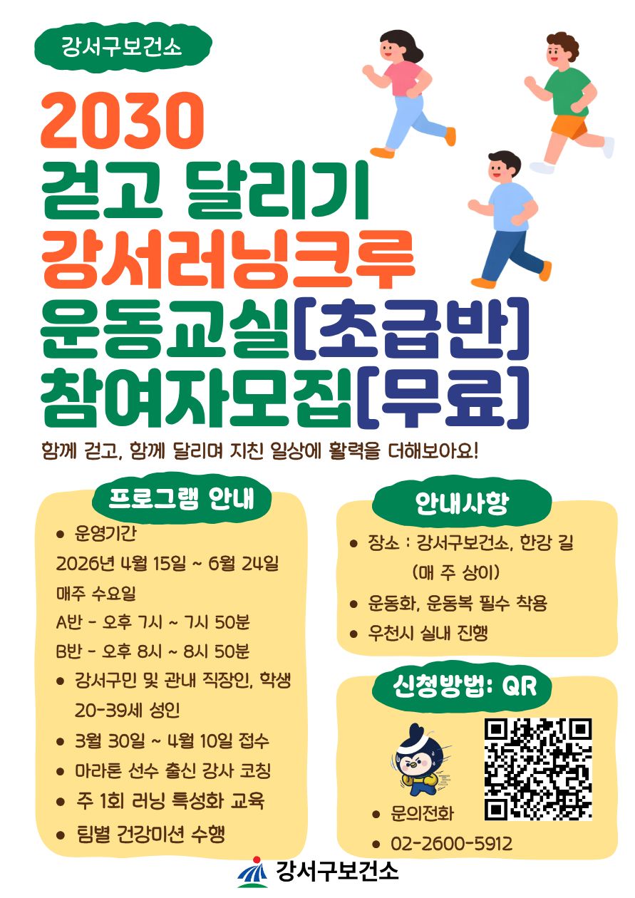 📆 일시: 2026. 4. 15.(수) ~ 6. 24.(수) / a반 19시 ~ 19시 50분, b반 20시~20시 50분 📆 접수기간: 2026. 3. 30.(월) ~ 4. 10.(금) 😀 대상: 강서구민 및 관내 직장인, 학생 20~39세 성인 📍 장소: 강서구보건소 및 한강 길(매주 상이, 우천 시 실내 진행) 📖 내용: 마라톤 선수 출신 강사가 코칭해주는 주 1회 러닝 특성화 교육 📞 문의: 강서구보건소(02-2600-5912)