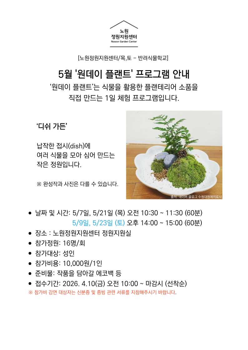 노원정원지원센터 <반려식물학교 5월 '원데이 플랜트: 디쉬 가든'> '원데이 플랜트'는 식물을 활용한 플랜테리어 소품을 직접 만드는 1일 체험 프로그램입니다. '디쉬 가든' 납작한 접시(dish)에 여러 식물을 모아 심어 만드는 작은 정원입니다. 날짜 및 시간 - 5/7, 5/21 (목) / 10:30~11:30(60분) - 5/9, 5/23 (토) / 14:00~15:00(60분) 장소 - 노원정원지원센터 정원지원실 참가정원 - 16명/회 참가대상 - 성인 참가비용 - 1만원/1인 준비물 - 작품을 담아갈 에코백 등 - 접수기간 4/10(금) 10:00 ~ 마감시(선착순)