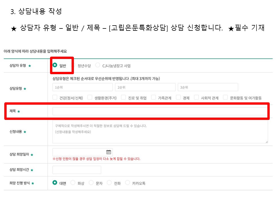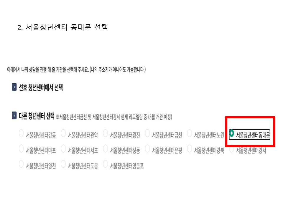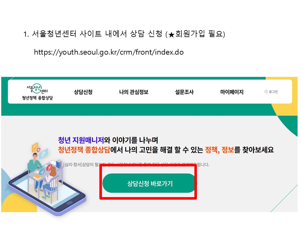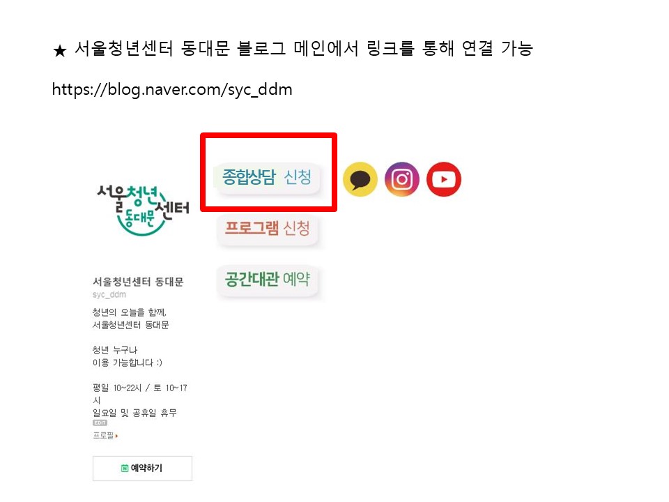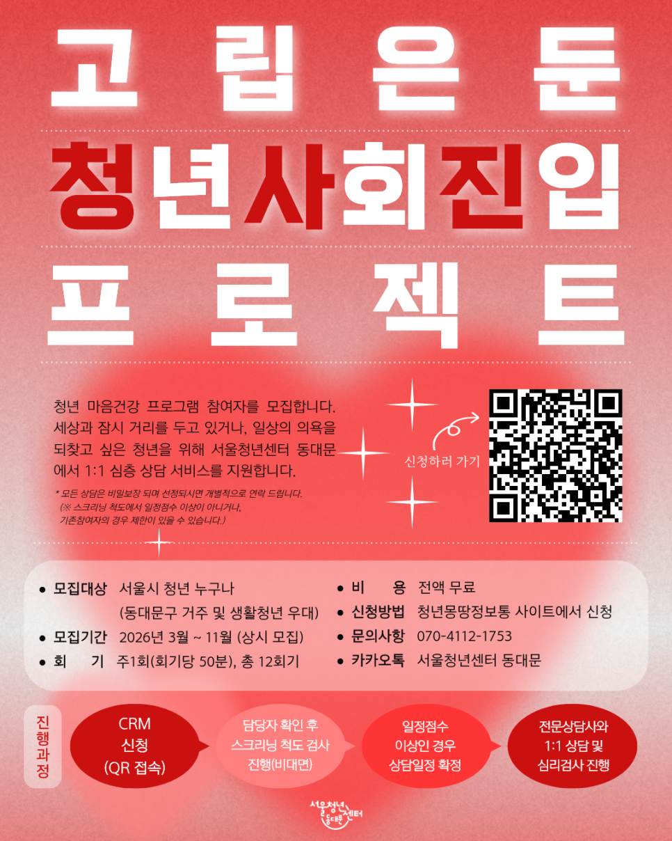 혼자만의 시간이 길어져 세상과의 연결이 낯설어진 당신의 마음을 두드립니다. 서울청년센터 동대문 <청.사.진>은 전문 상담사와 마주 앉아 온기를 나누는 12주간의 대화를 지원합니다. 누구에게도 말 못한 고민, 이제 안전한 이곳에서 함께 나누고 다시 시작해보세요. 🍒 신청방법 🍒 참여 대상 19~39세 서울시 청년 누구나(동대문구 거주 및 생활청년 우대) + 「청년의 사회적 고립측정」스크리닝 척도에서 일정 점수 이상 🍒 참여 방법 1) 상담 신청📝 2) 담당 매니저가 3일 이내(평일 기준) 스크리닝 척도를 보내준다. 3) 선정되면 상담일정을 잡고 상담을 시작한다. 🍒 상담 분야 1) 고립, 은둔의 어려움으로 발생하는 심리, 정서적 어려움 2) 고립, 은둔(가능)의 문제로 발생하는 진로 및 취업, 가족관계, 대인관계 어려움 (신청서에 상담 내용을 보다 구체적으로 기입해주시면 원활한 상담이 가능합니다!) 🍒 신청 문의 1) 전화 070-4112-1753 2) 카카오톡 '서울청년센터 동대문' 🍒 신청하러 가기 ↓ 서울청년센터 청년정책 종합상담 https://youth.seoul.go.kr/crm/front/index.do