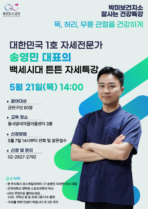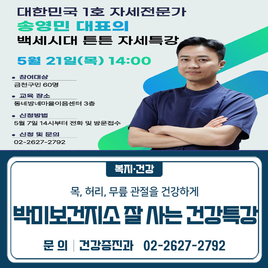 박미보건지소 잘사는 건강특강! 이번에는 목과 허리, 무릎 관절을 건강하게 지켜주는 바른 자세 만들기 특강을 준비했습니다🤗 일 시: 5. 21.(목) 14:00~15:00 장 소: 동네방네 마을이음센터 3층 다목적 체육관 (시흥대로 12길 10-5) 동네방네 마을이음센터 서울특별시 금천구 시흥대로 12길 10-5 모집대상: 금천구민 60명 신청기간: 5. 7.(목) 14:00 ~ 선착순 모집...