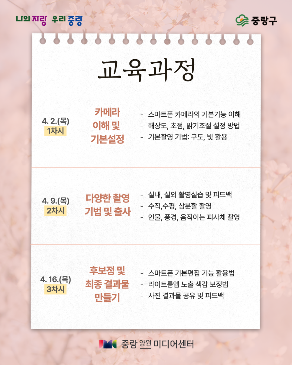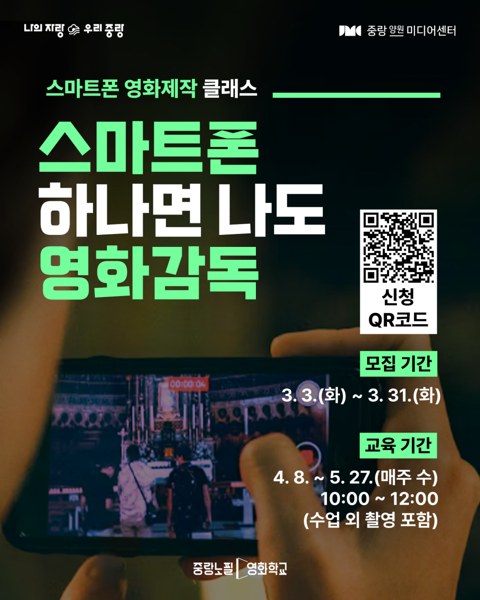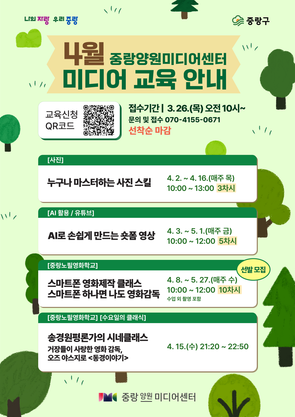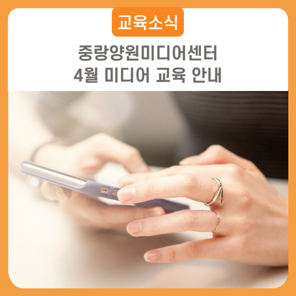 [교육소식] 중랑양원미디어센터 4월 미디어 교육 안내문입니다. 중랑양원미디어센터(☎ 070-4155-0671)에서 4월 미디어 교육을 안내드립니다~ ※ 3월 26일(목) 오전 10시부터 선착순 접수 📌 사진 누구나 마스터하는 사진 스킬 📌 AI 활용 / 유튜브 AI로 손쉽게 만드는 숏폼 영상 📌 중랑노필영화학교 스마트폰 영화제작 클래스 스마트폰 하나면 나도 영화...