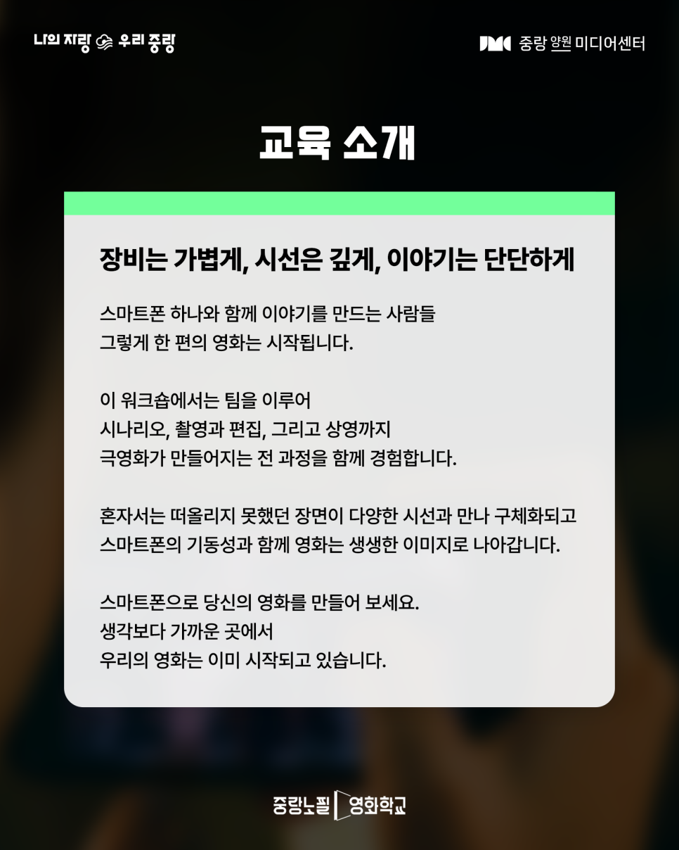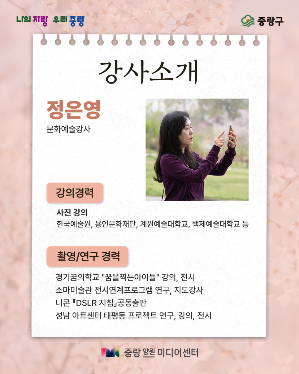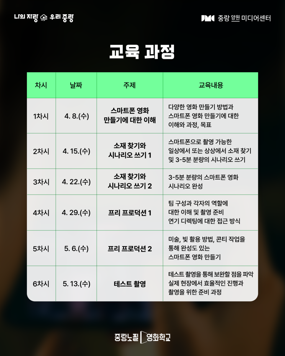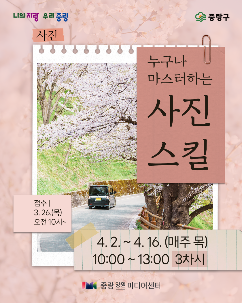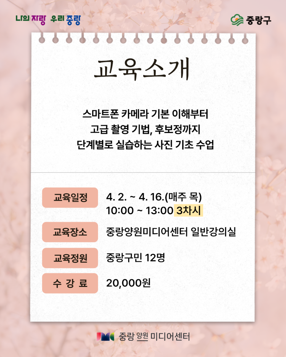 [교육소식] 중랑양원미디어센터 4월 미디어 교육 안내문입니다. 중랑양원미디어센터(☎ 070-4155-0671)에서 4월 미디어 교육을 안내드립니다~ ※ 3월 26일(목) 오전 10시부터 선착순 접수 📌 사진 누구나 마스터하는 사진 스킬 📌 AI 활용 / 유튜브 AI로 손쉽게 만드는 숏폼 영상 📌 중랑노필영화학교 스마트폰 영화제작 클래스 스마트폰 하나면 나도 영화...