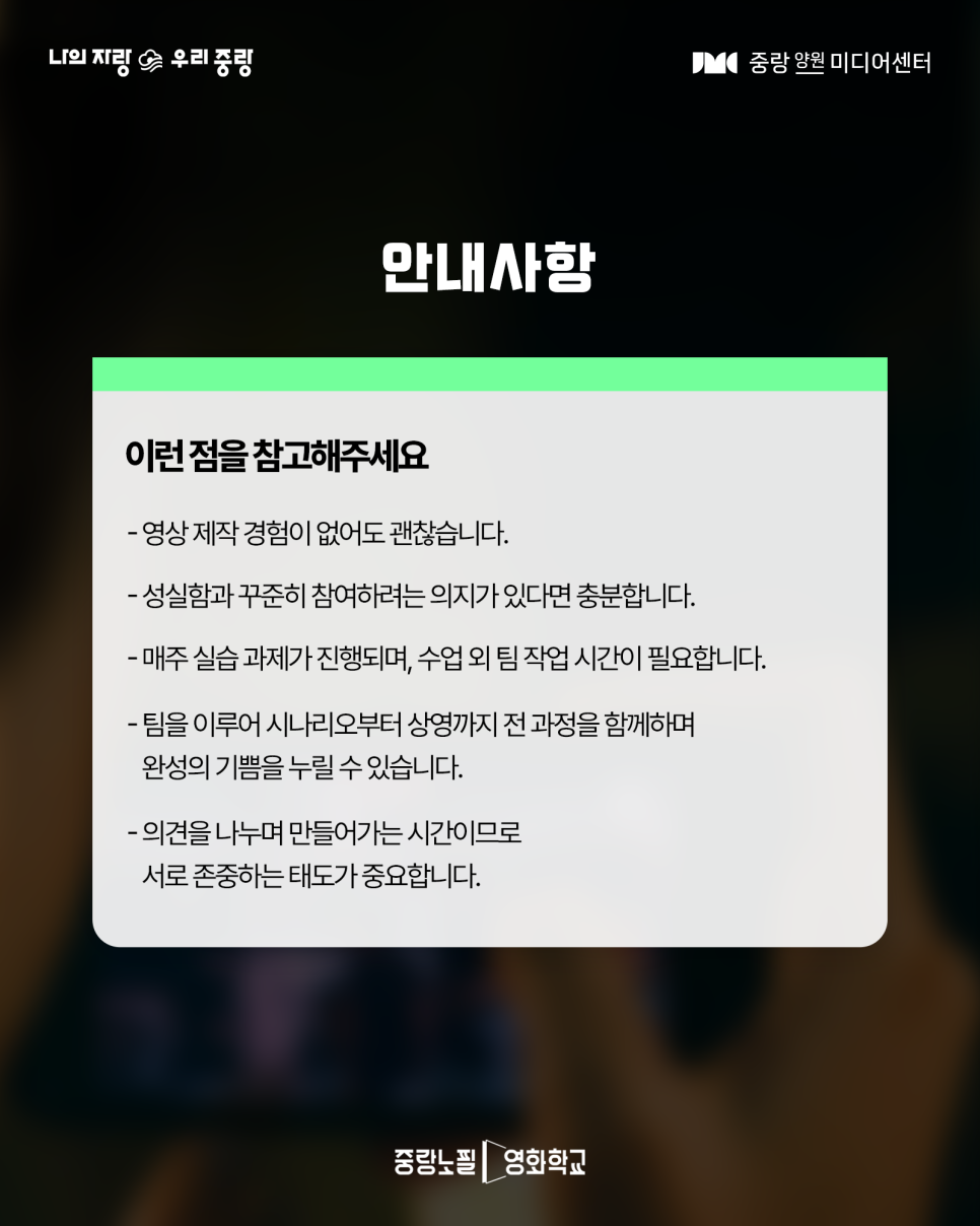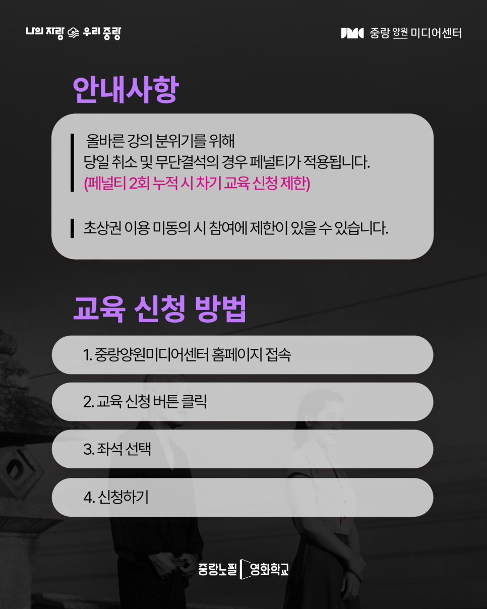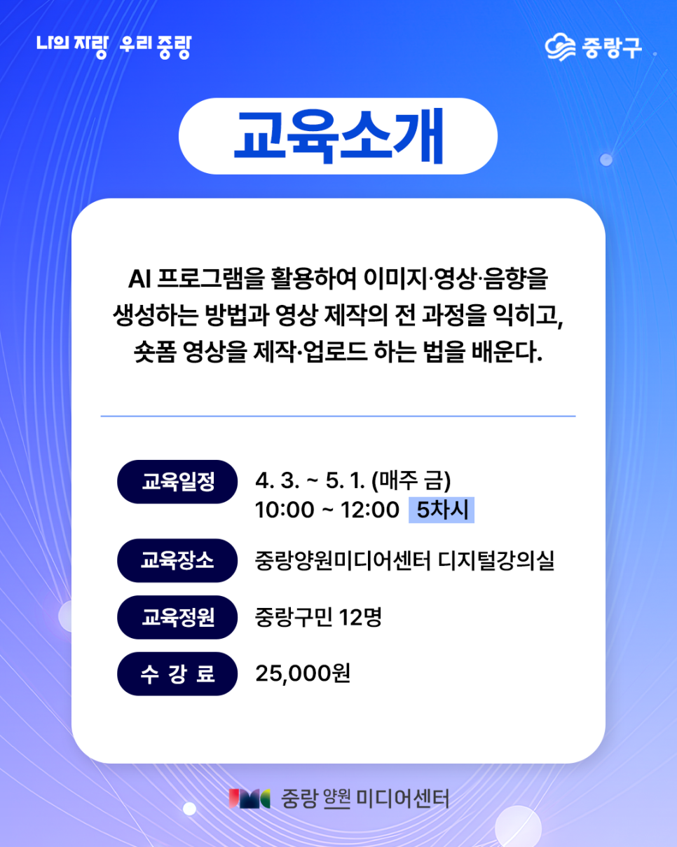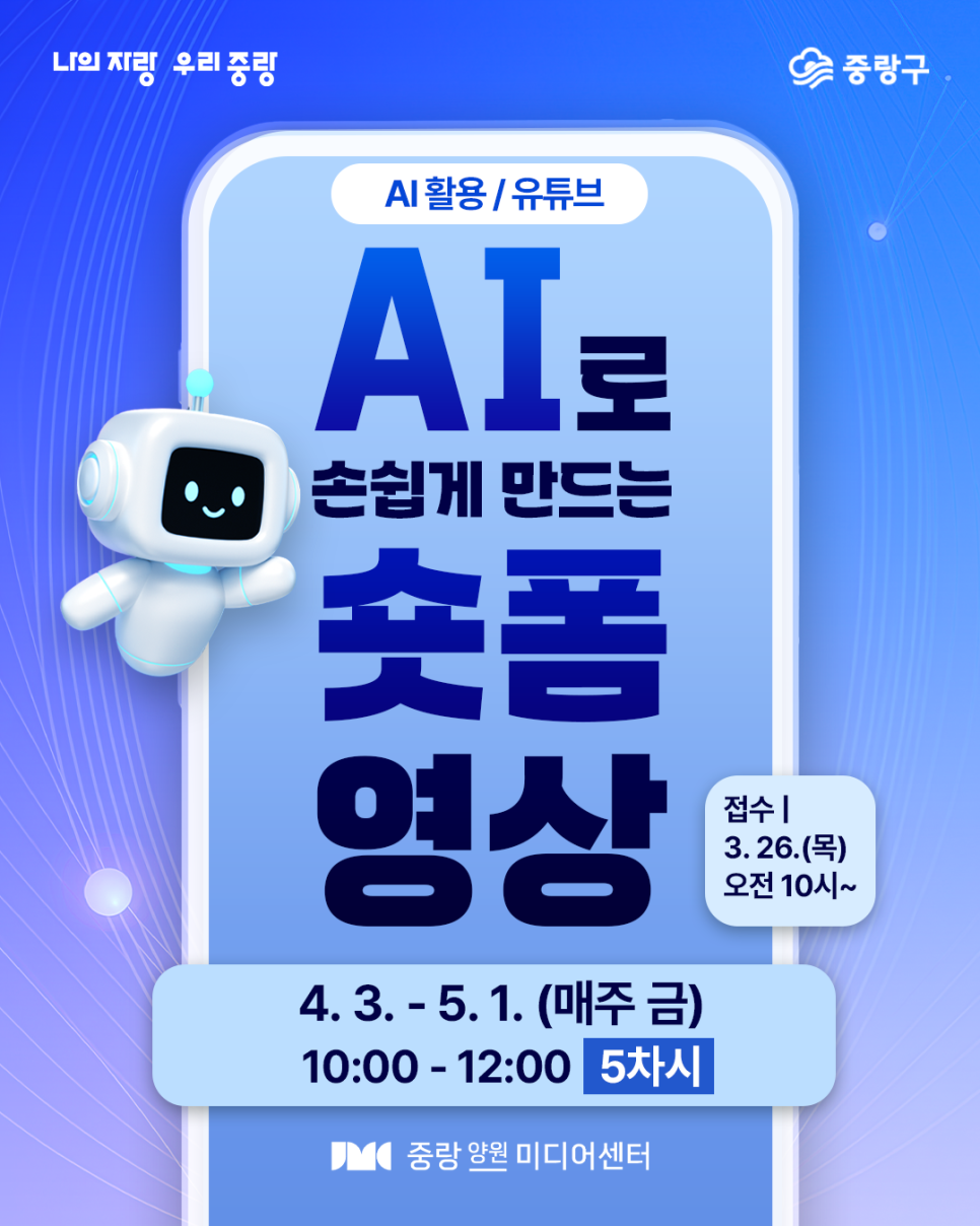 [교육소식] 중랑양원미디어센터 4월 미디어 교육 안내문입니다. 중랑양원미디어센터(☎ 070-4155-0671)에서 4월 미디어 교육을 안내드립니다~ ※ 3월 26일(목) 오전 10시부터 선착순 접수 📌 사진 누구나 마스터하는 사진 스킬 📌 AI 활용 / 유튜브 AI로 손쉽게 만드는 숏폼 영상 📌 중랑노필영화학교 스마트폰 영화제작 클래스 스마트폰 하나면 나도 영화...