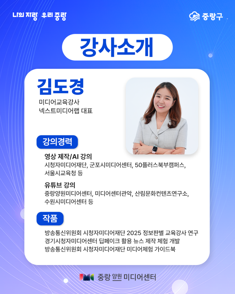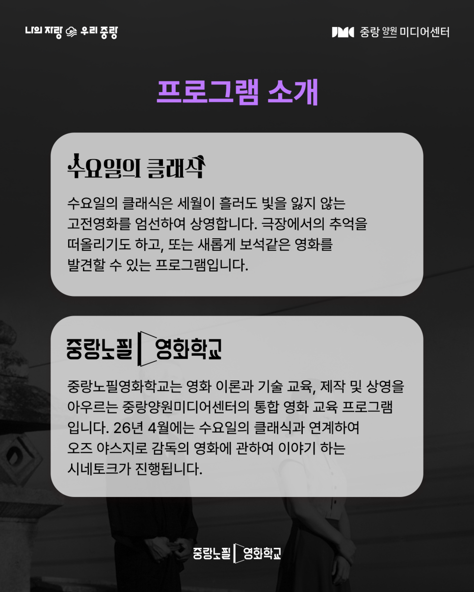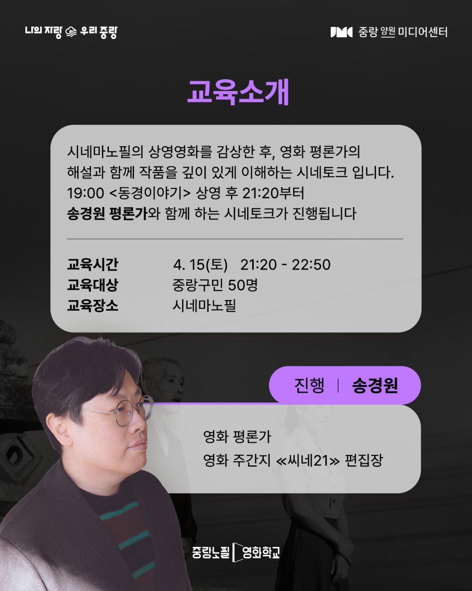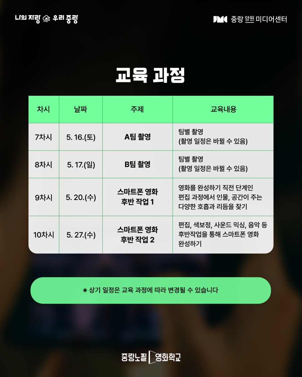[교육소식] 중랑양원미디어센터 4월 미디어 교육 안내문입니다. 중랑양원미디어센터(☎ 070-4155-0671)에서 4월 미디어 교육을 안내드립니다~ ※ 3월 26일(목) 오전 10시부터 선착순 접수 📌 사진 누구나 마스터하는 사진 스킬 📌 AI 활용 / 유튜브 AI로 손쉽게 만드는 숏폼 영상 📌 중랑노필영화학교 스마트폰 영화제작 클래스 스마트폰 하나면 나도 영화...