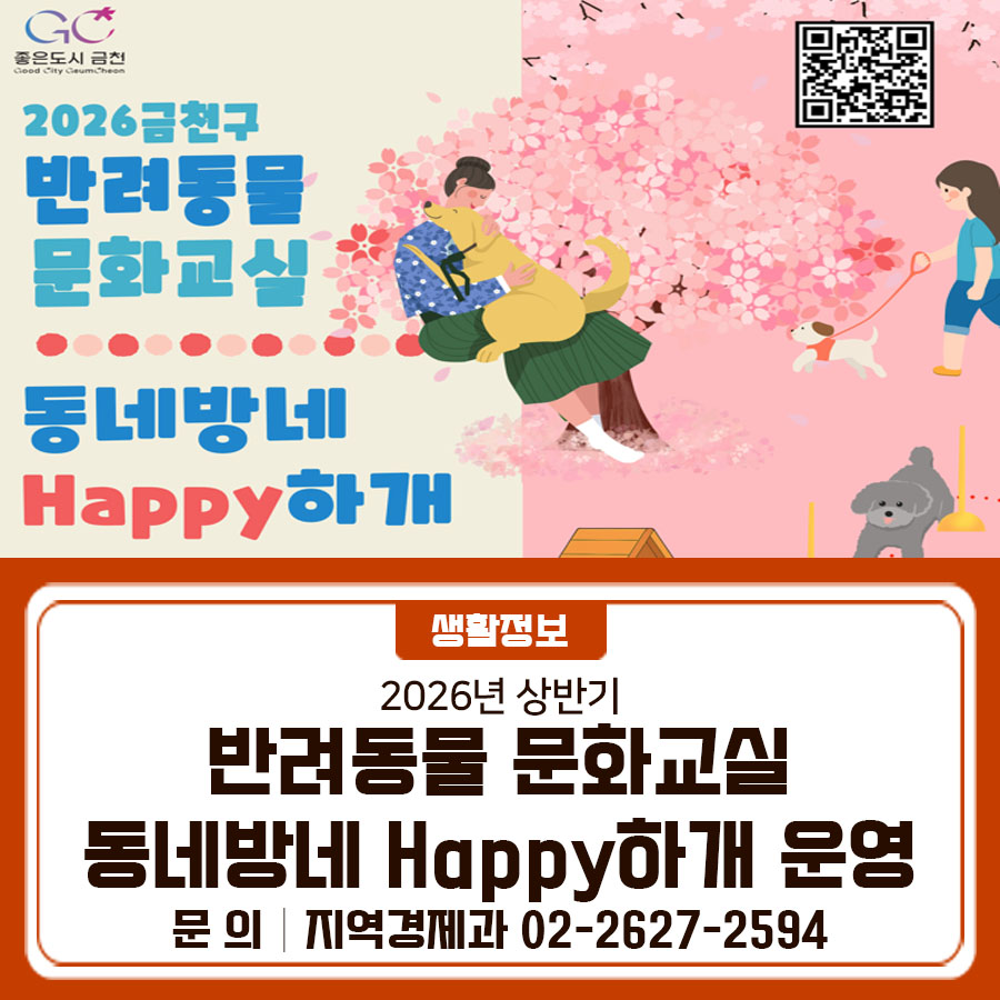 2026 반려동물 문화교실 동네방네 Happy 하개를 운영합니다!🐶 반려견 행동교정 교육과 어질리티 교육을 받고 싶다면, 늦기 전에 신청하세요😉 교육일시 2026. 4. 3.(금), 4. 10.(금), 4. 17.(금), 4. 24.(금) 중택1 신청기간 2026. 3. 16.(월) ~ 3. 30.(월) [결과발표 : 4. 1.(수)까지] 장 소 금천구 반려견 놀이터(시흥동 784...)