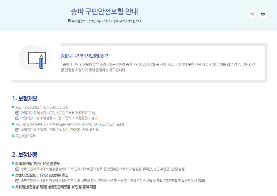 📢 송파구민이라면 누구나 보장🛡️ 송파 구민안전보험 송파구가 우리 구민들의 일상을 더 든든하게 지켜드리기 위해 송파 구민안전보험을 4월 1일부터 시작합니다! 🎉 송파구에 주민등록이 된 모든 구민(국내 거소신고자 및 등록 외국인 포함)이라면 별도 절차나 가입료 없이 자동으로 가입됩니다! ✅ 상해의료비: 최대 10만원 한도(단, 본인부담금 3만원 발생) ✅ 상해사망장례비...