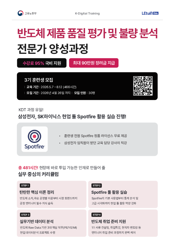 🧾교육소개 k-Digital Training 과정은 고용노동부가 주관하는 국비지원과정으로 반도체 산업에 필요한 직무 역량을 강화하고 전문성과 실무 경험을 쌓을 수 있도록 반도체 이론, 실습, 프로젝트, 취업지원 서비스를 제공합니다. 📅기간 및 일정 모집기간 : 26.04.06~26.04.25 교육기간 : 26.05.07~26.08.12 🏢훈련 장소 렛유인에듀 1캠퍼스 : 서울 강남구 강남대로 368 동인 빌딩 5층 👤참가자격 -내일배움카드 보유 또는 신규 발급이 가능자 -K-Digital Training 과정 수강 이력이 없는 분 *기존의 수강한 적이 있더라도 수강 철회 기간 내에 철회한 경우 직업 훈련 이력에 남지 않으므로 수강 가능합니다. -오프라인 강의 참석 가능자 🔗신청방법 수강신청은 아래의 링크를 통해 신청해주시면 됩니다. ▶ https://vo.la/Qbj4ehx 🎁혜택 - 수강료 95% 국비지원 - 월 최대 훈련 장려금 30만원 지급 - 실물 교육 수료증 제공 - 실시간 커뮤니케이션(출결 확인과 공지 전달 등 학습 전반을 실시간 케어) ○ 문의 - ☏ 1668-1362