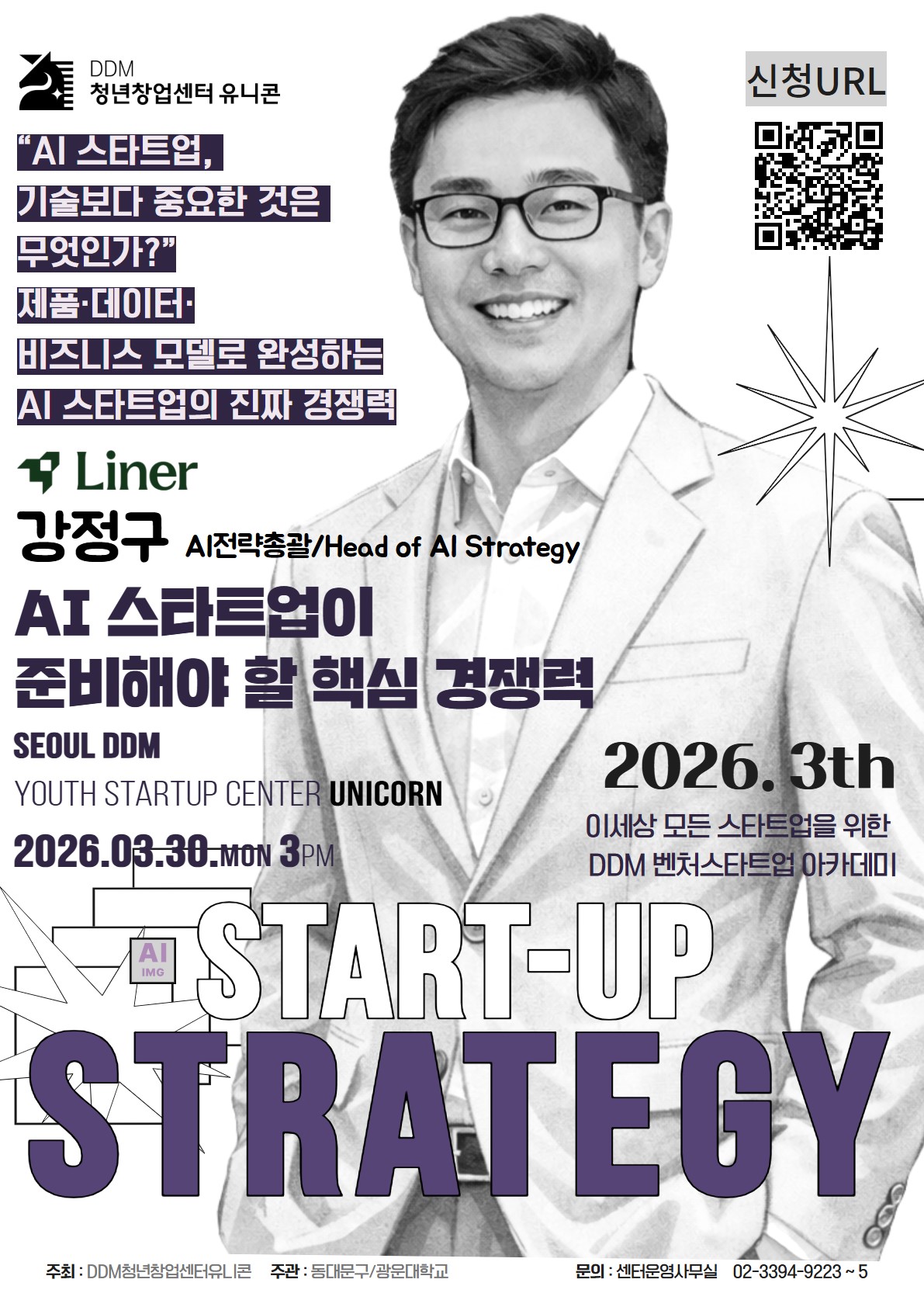 1. 강의 개요 ○ 강 의 명 : AI 스타트업이 준비해야 할 핵심 경쟁력 ○ 일 시 : 2026. 3. 30.(월) 15:00 ○ 장 소 : 동대문구 망우로 46, 회기역 하트리움 101동 2층(DDM 청년창업센터 유니콘) ○ 참가대상 : 창업에 관심 있는 누구나 ○ 강 의 자 : 강정구 라이너 AI 전략총괄 2. 신청방법 : 구글폼 개별 접수(https...