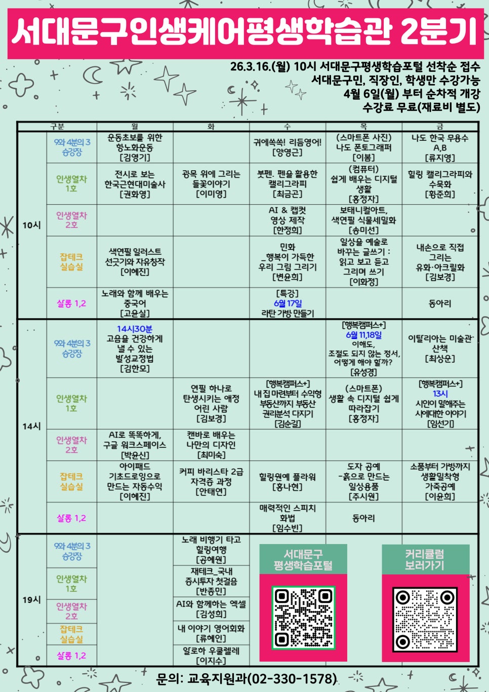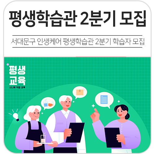서대문구 인생케어 평생학습관에서 2026년 2분기 평생학습 프로그램 학습자를 모집합니다. 다양한 배움의 기회를 통해 취미와 역량을 키울 수 있는 프로그램이 준비되어 있습니다. 🗓️ 모집기간 2026년 3월 16일 월요일 오전 10시부터 선착순 마감 📚 수강기간 2026년 4월 6일 월요일부터 순차적 개강 (10주 과정) 👩🏫 모집대상 서대문구민 직장인 학생 💻...