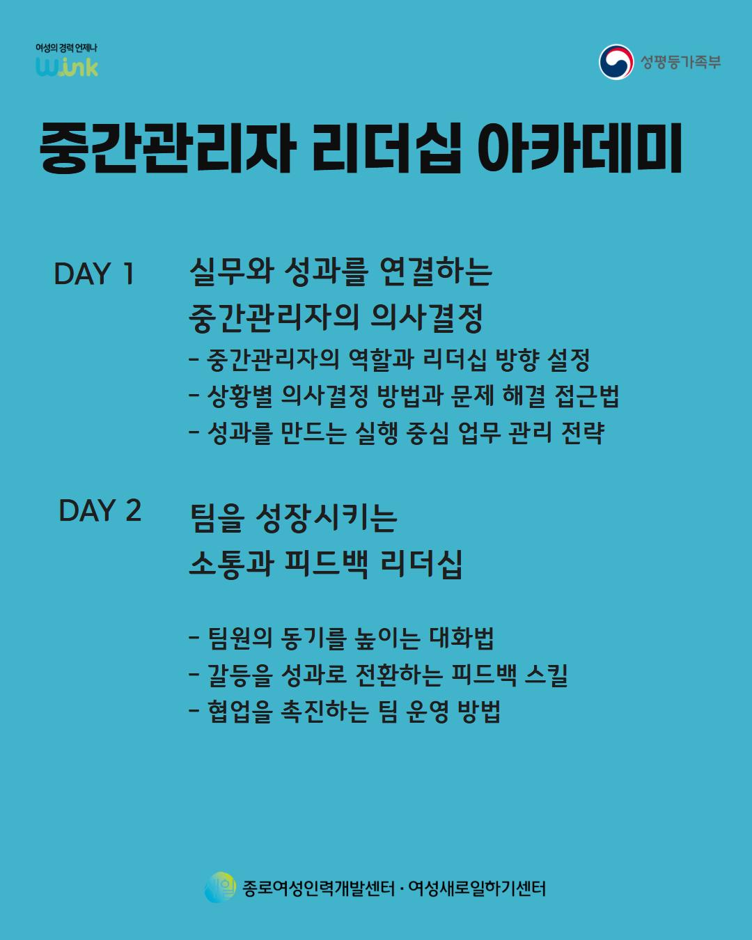 •사업목적: -실무와 리더 사이, 중간리더로 고민하는 관리자의 역량을 강화하고 설장할수 있도록 돕기위한 교육 프로그램. - 역량 강화 교육과 함께 안정적인 직장생활과 경력 개발을 지원하고자 함. •신청대상: - 재직 기간 5년이상 10년 미만 중간관리자급 재직여성 - 중간관리자 승진 이후 2년 이상 경과한 재직여성 •신청기간: 2026년 3월 25일 ~ 2026년 4월 15일 (선착순 아님) •진행내용: 실무와 리더 사이, 중간리더 의사결정 가이드 • AI시대의 중간관리자 역할 재정립 - 조직 내 역할 인지 및 이해 • 문제의 흐름을 정리하는 의사결정훈련 - 감정이 아닌 구조로 문제 분석하기 관계를 살리는 피드백 대화 • 환경변화에 따른 소통 방식 이해 - 커뮤니케이션 방식 재점검 • 신뢰를 강화하는 코칭 대화 스킬 - 진짜 공감, 경청, 질문 •진행일시: 2026년 4월 21일(화)19:00~21:30, 4월 23일(목)19:00~21:30/양일 모두 참석 •신청방법: 구글폼 신청(접수 후 선발/선착순 아님) (※ https://forms.gle/HL9mhFwn2f54onuQ6 또는 QR코드 접속 후 신청) •문의:종로여성인력개발센터 경력단절예방지원사업 070-4048-5681