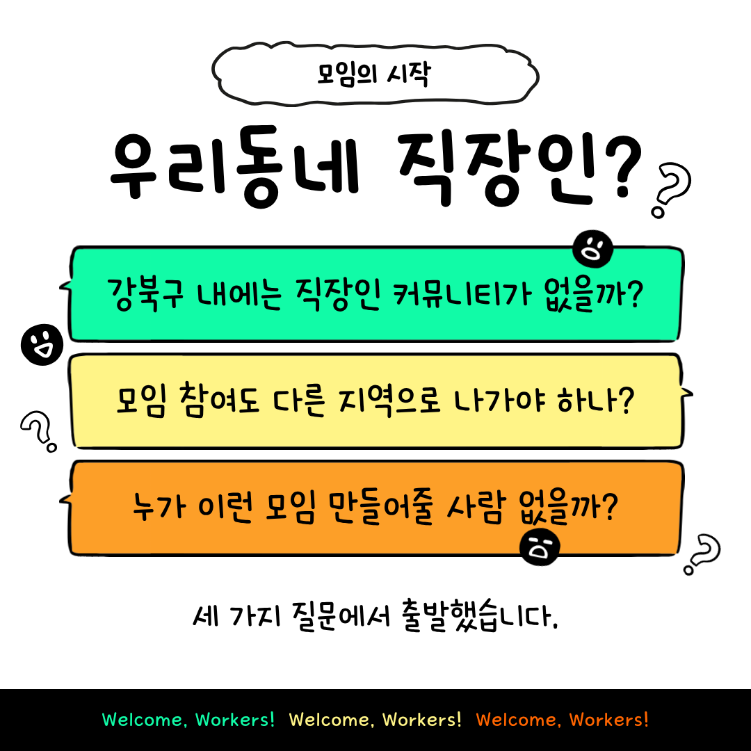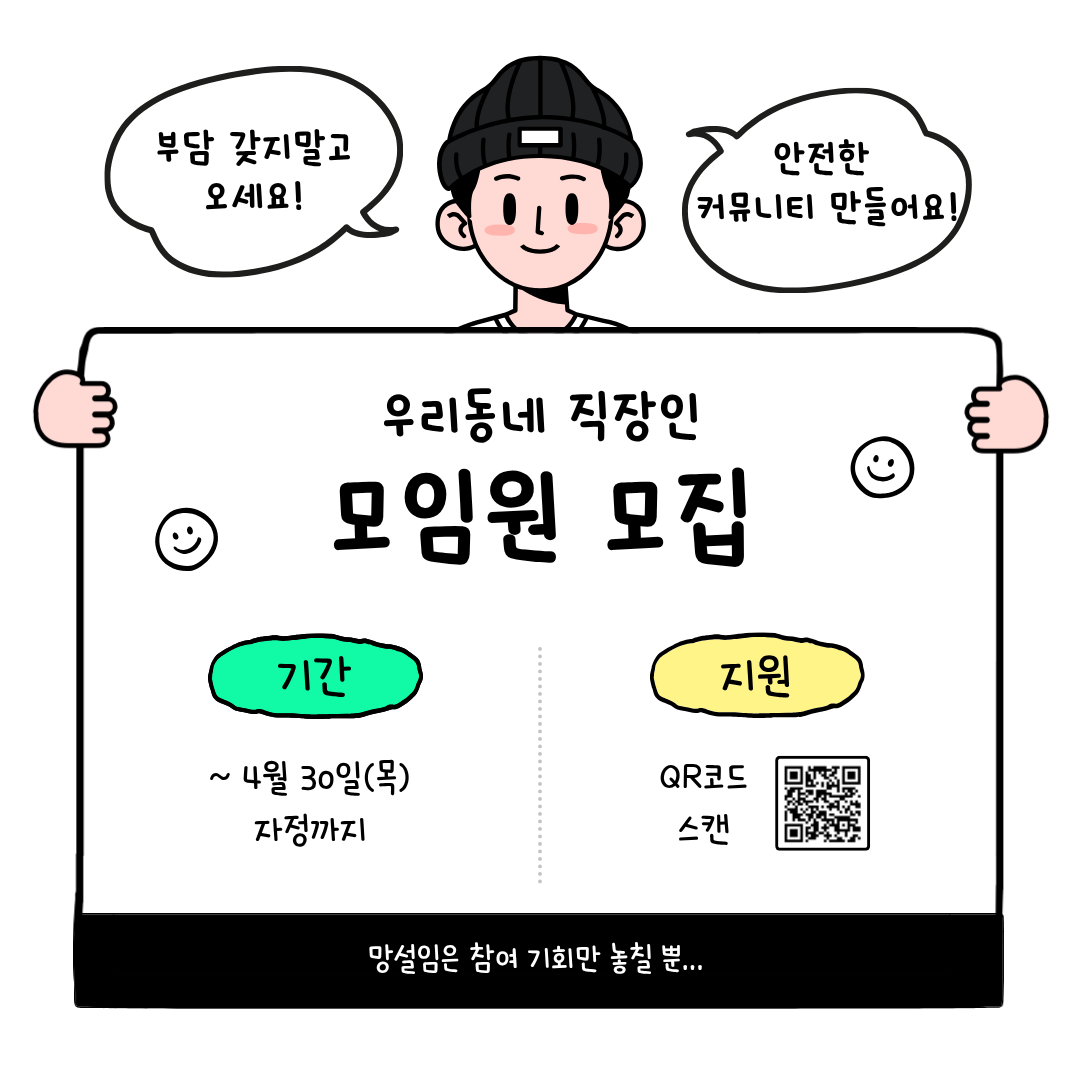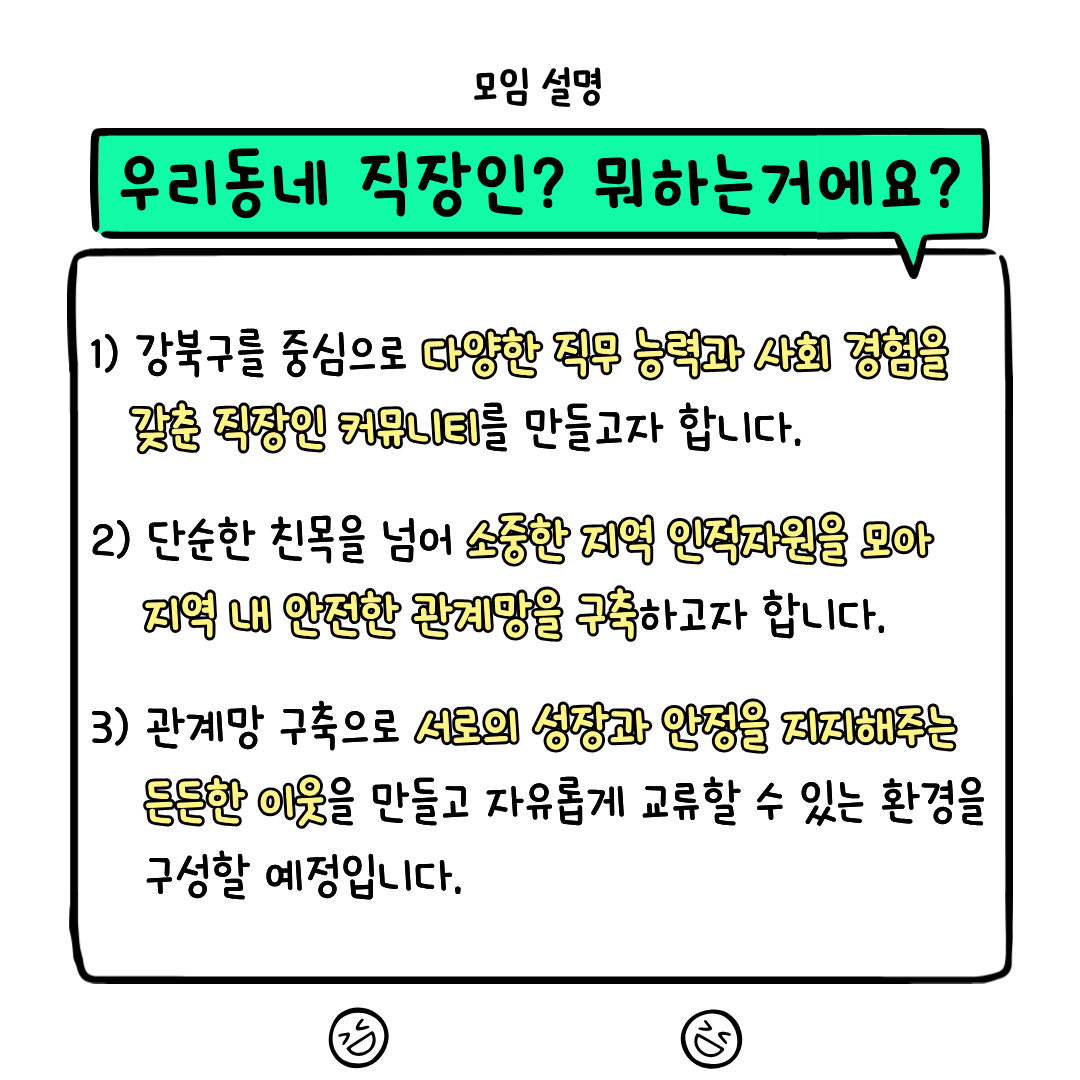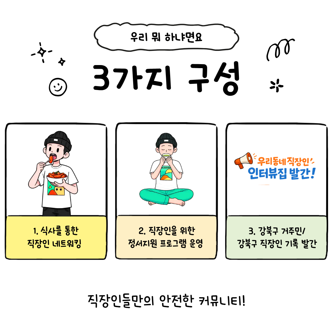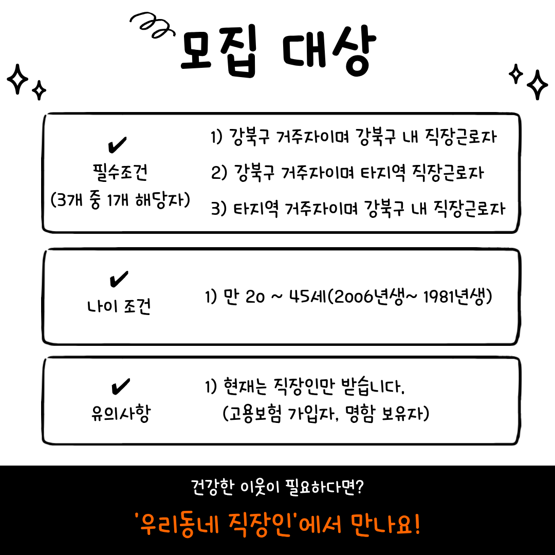 📣 강북구 마을공동체 지원사업 선정!! 📣 📣 강북구 직장인들 주목! 멀리 가지 말고 우리 동네에서 만나요! 🏃♂️🏃♀️ ”강북구에는 직장인 커뮤니티가 없을까?“ ”모임 참여하러 다른 지역까지 가야 하나?“ 이런 고민 해보신 적 있나요? 🤔 단순한 친목을 넘어 서로의 성장과 안정을 지지해 줄 든든한 동네 이웃! 직장인들만의 안전한 커뮤니티 <우리동네 직장인> 에서 새로운 모임원을 모집합니다. 🙌 ✨ 우리 뭐 하냐면요! 1️⃣ 맛있는 식사를 통한 직장인 네트워킹 🍽️ 2️⃣ 직장인들의 힐링을 위한 정서지원 프로그램 🧘♀️ 3️⃣ 강북구 거주민/직장인들의 이야기를 담은 인터뷰집 발간 📖 🙋♂️ 이런 분들을 찾아요! ✔️ 대상: 강북구 거주자 OR 강북구 내 직장인 ✔️ 나이: 만 20세 ~ 45세 (81년생~06년생) ✔️ 필수: 현재 직장에 재직 중이신 분 (고용/건강보험 가입자, 명함 보유자 등 확인 진행 예정) 🗓️ 모집 및 참여 안내 모집 마감: ~4월 30일(목) 자정까지 참여 방법: 신청서 제출 ➡️ 운영진 온라인 사전 미팅 ➡️ 정기/상시 일정 참여 신청 링크: 관련 링크 클릭! 💡 모임이 더 궁금하시다면? [온라인 설명회]에 오세요! 모임에 대해 더 자세히 알고 싶은 분들을 위해 비대면 설명회를 진행합니다. 일시: 4/25(토) 오전 10시 (약 30~40분 진행) 신청: 프로필 링크 내 구글폼 접수 건강하고 든든한 동네 인적자원망, 함께 만들어가요! 망설임은 참여 기회만 놓칠 뿐입니다. 많은 관심과 지원 부탁드려요! 😉