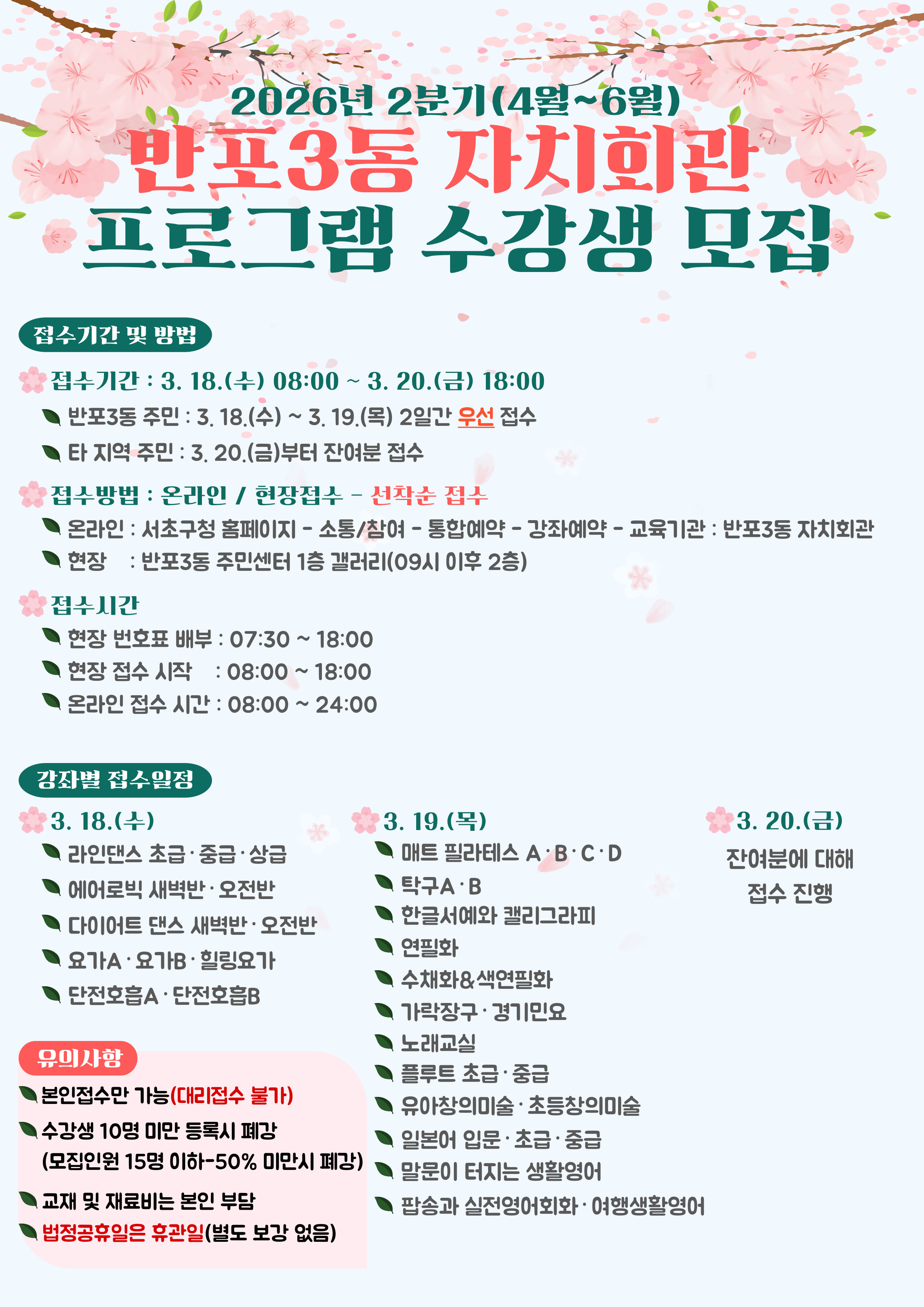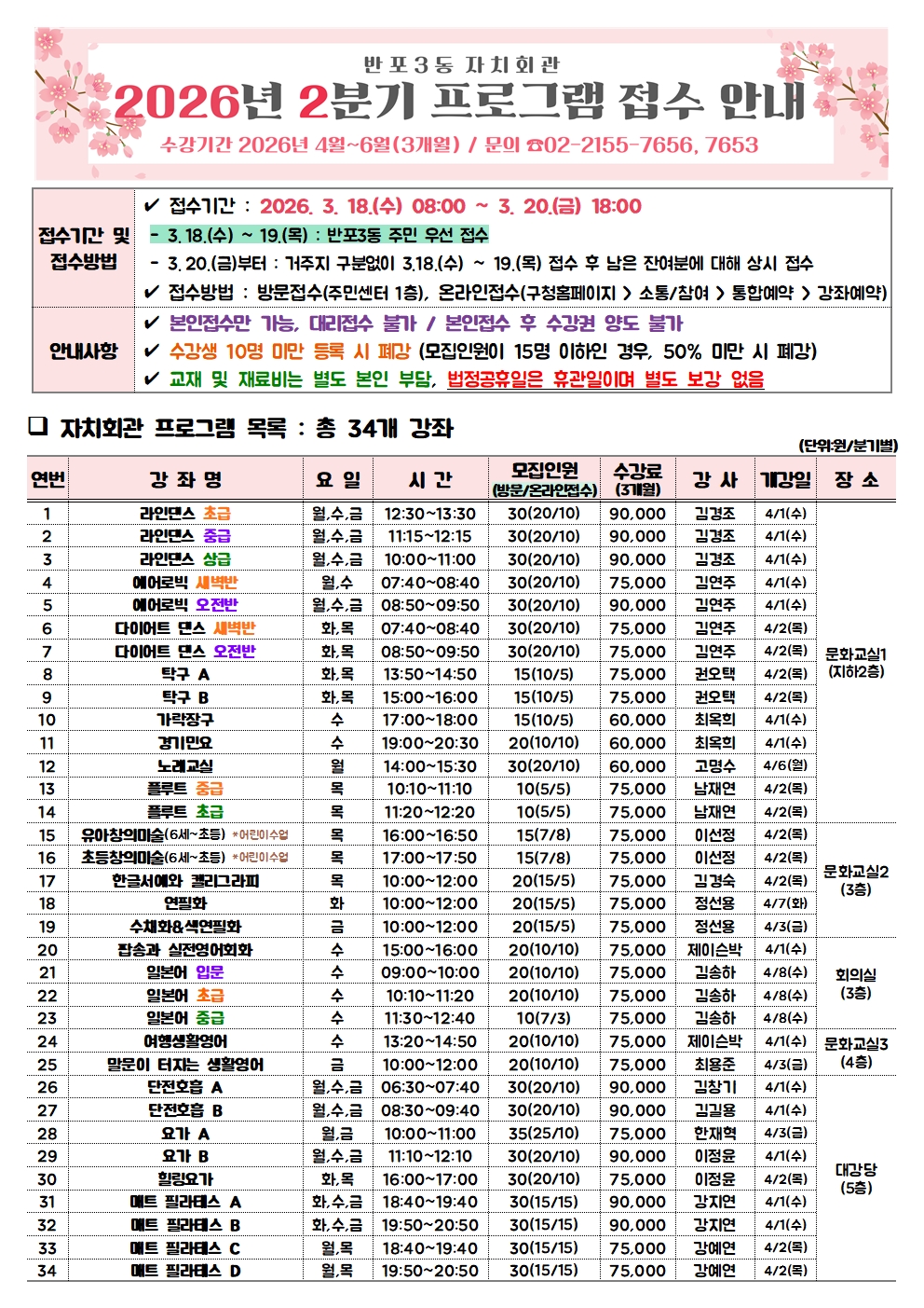 반포3동 자치회관에서 2분기 프로그램 수강생을 모집 중이니 관심 있는 강좌 신청해봐!